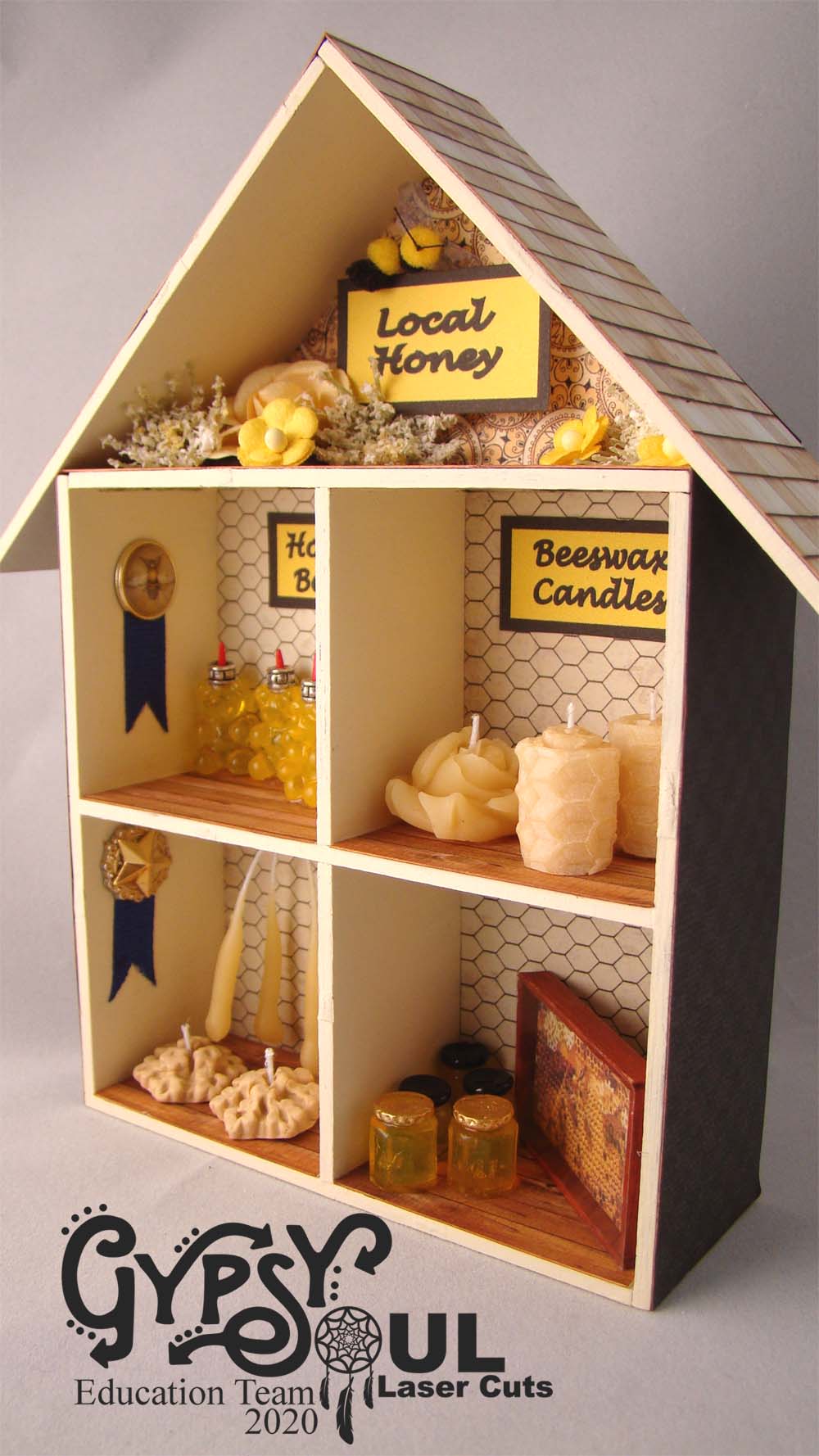 Brian and I have kept bees off and on over the years and I spent many seasons at our local farmer’s market selling our honey (and lamb, eggs, produce, beeswax candles, soap & pottery). The GSL Mini House Room Box 4 Cubbies gave me the idea to make a miniature farm stand display that would make a beekeeper proud. Let me take you through how it came together.