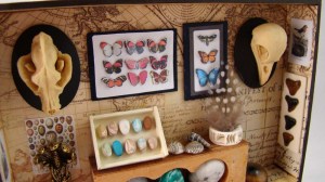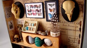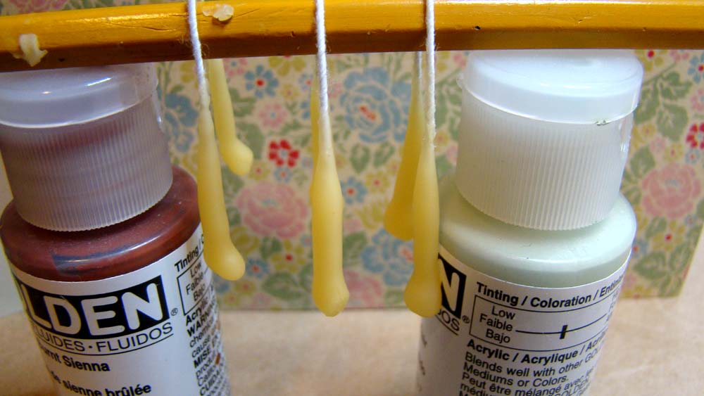 I made some fun things to go inside the display, starting with miniature candles made by dipping white florist wire in melted beeswax from our hives. Once cooled, they went on a small brass hook. I added a few descriptive signs.