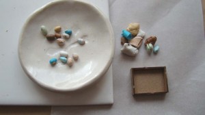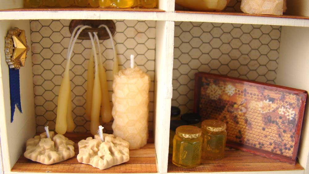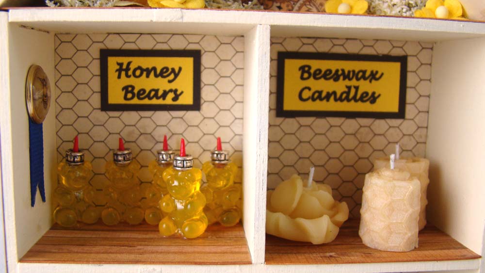 These floral candles on the left are simply molded polymer clay fitted with a florist wick. The observation hive cubby also contains resin honey jars.