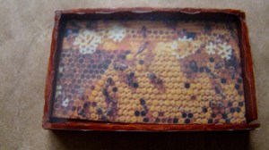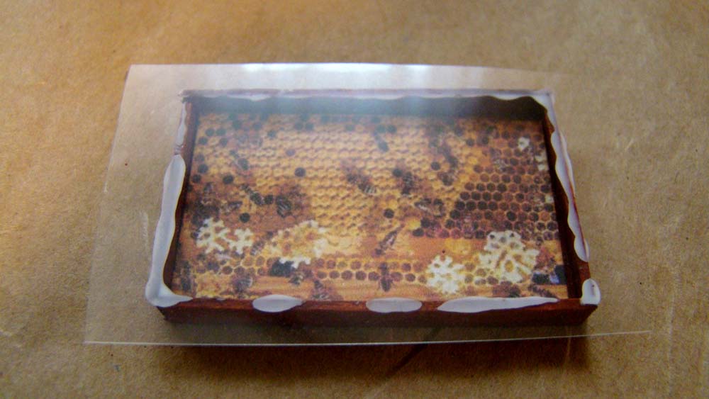We never had an observation hive to take to the farmer’s market but a lot of honey vendors do. I started with a printed image and cut craft sticks to size. They were glued together and painted brown.