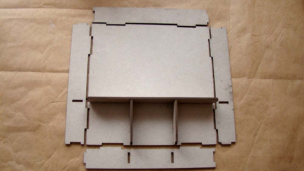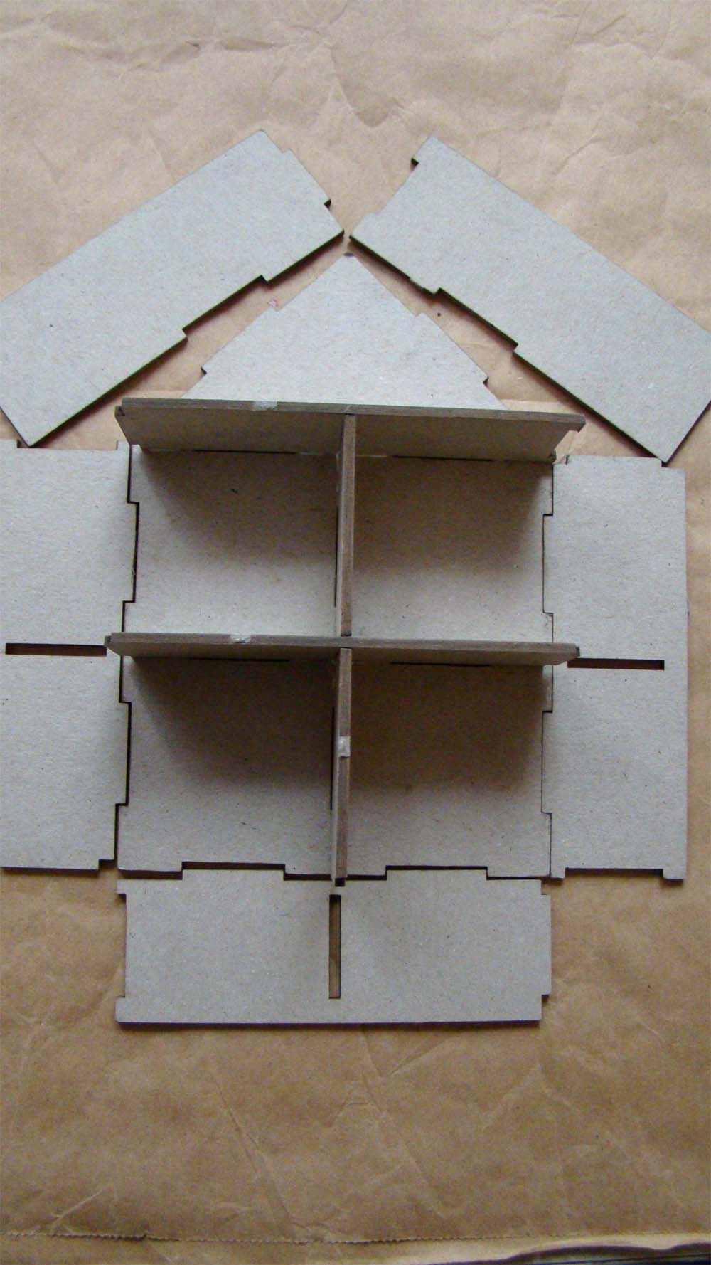 Here are the chipboard pieces laid out. The interior of the house has interlocking pieces that make up the cubby sections.