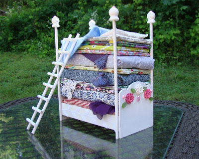 Two kinds of mattresses were made for the bed – thin and thick. The thin ones were simply a layer of quilt batting sewn between two layers of fabric. The thick ones involved no sewing at all. I had some squishy packaging material in my stash that I cut into rectangles. I wrapped some fabric around those and glued it in place. A clothespin held the fabric in place while the glue dried.