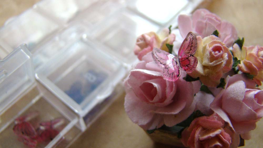 The little pink bouquet of paper flowers is being visited by an acrylic butterfly nail charm (I also landed one on the Pink Heart Cake with Roses).