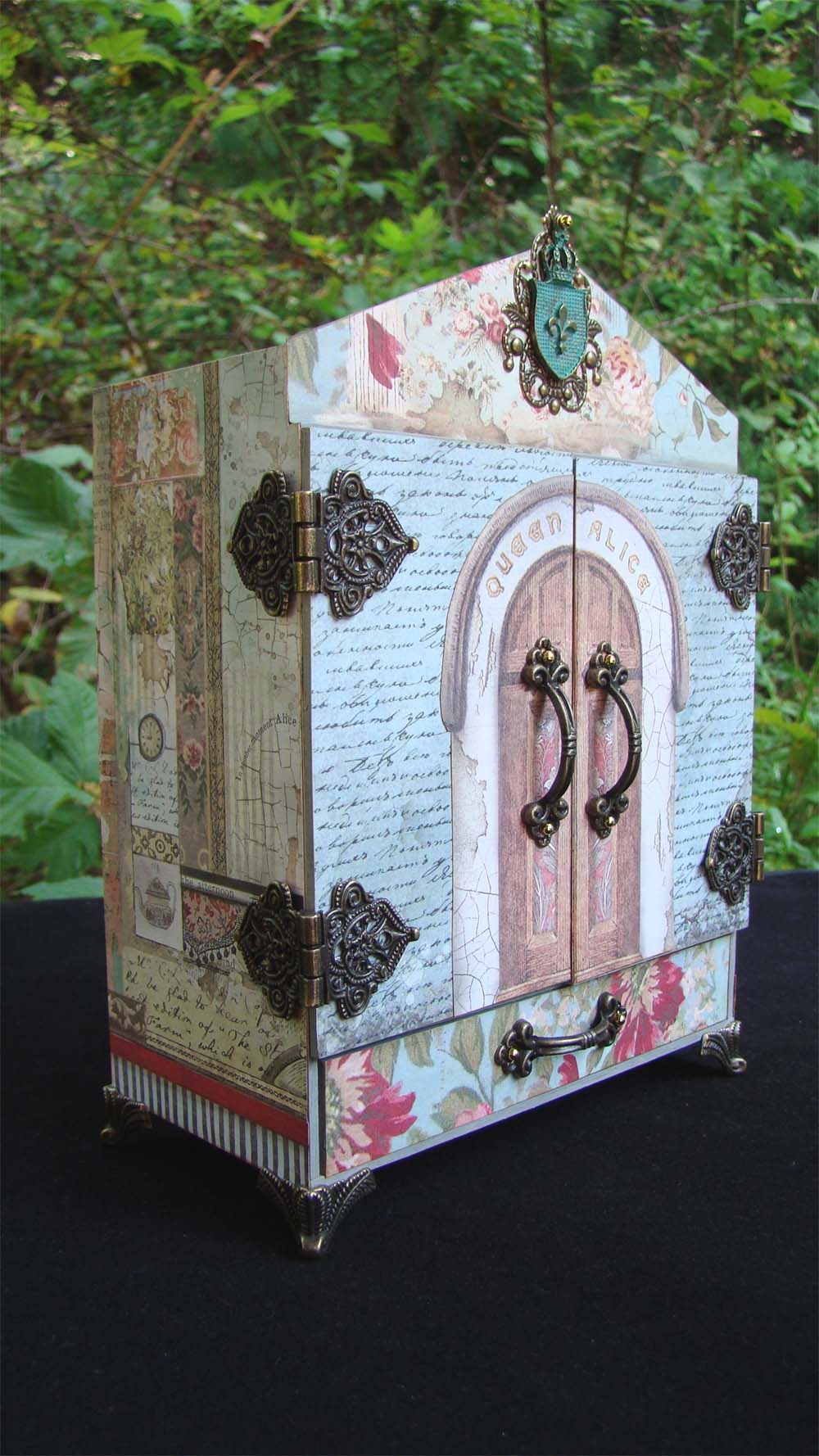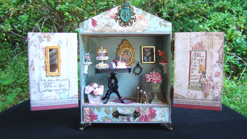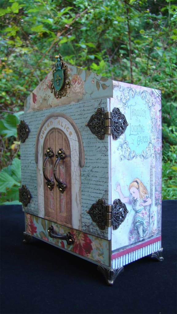 I have a pretty little project for Alpha Stamps to share with you today that features Stamperia’s new Alice Through the Looking Glass papers. There are so many gorgeous papers in this collection I had a hard time choosing which ones to use. The base for this project is a House Shrine with Doors – Medium, the perfect vessel to set a Queen Alice scene inside.