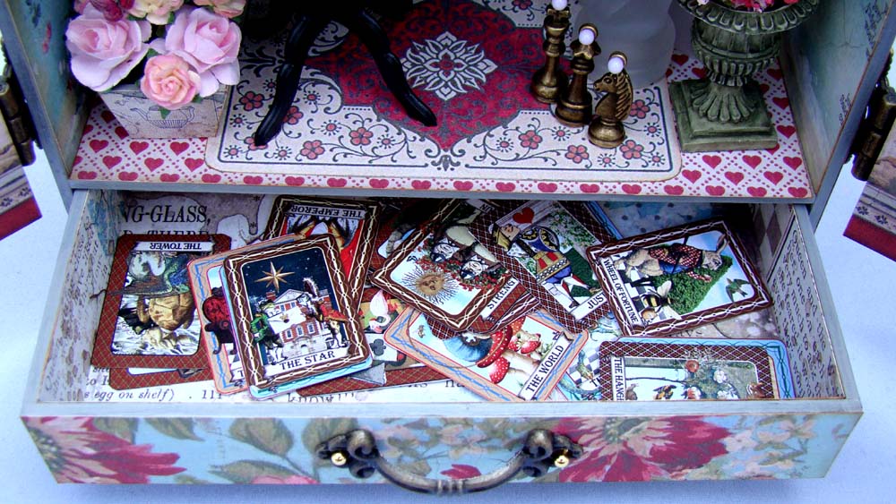 This little shrine includes a drawer that I filled with cards cut from a Mini Alice Tarot Half Sheet.