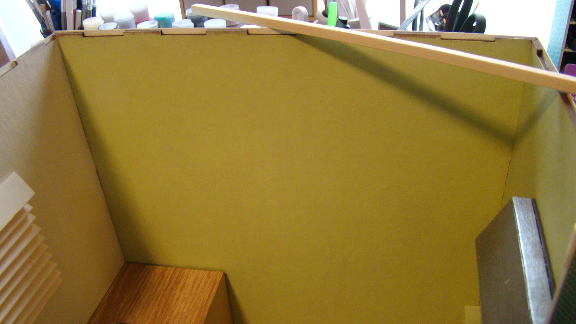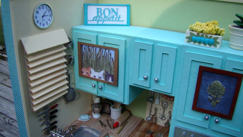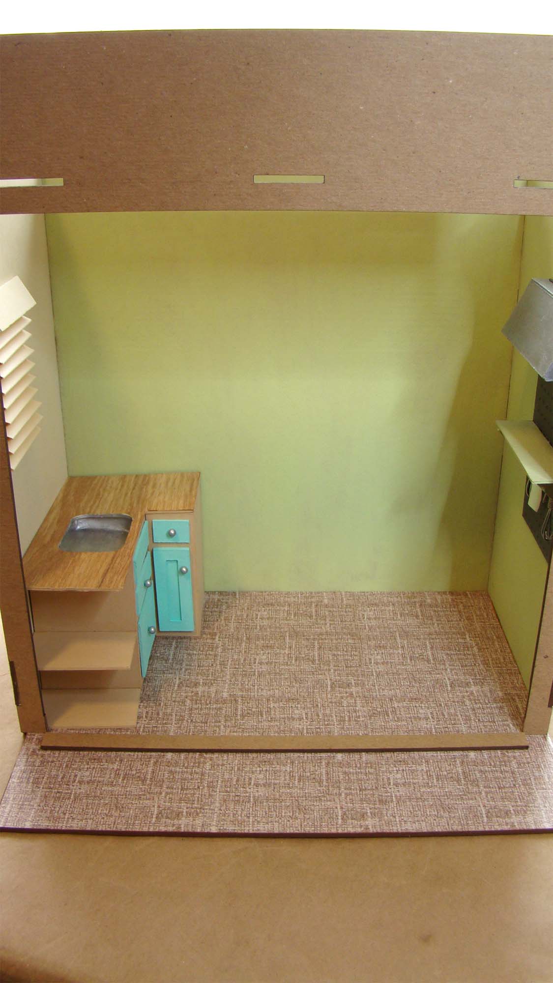This room box has a front piece that adds an additional 2 inch facade to the top of the structure. Here I am holding it in place to decide if I want to include it, along with the roof/ceiling of the structure. I eventually decided I wanted the room open so all of the miniature details could be easily seen. The floor is a sheet of DCWV Photoreal linen paper that I thought looked like 1950’s linoleum. The countertop is a woodgrain paper. The walls were painted with acrylics, the cabinet pulls are straight pin heads. The sink was molded from polymer clay.