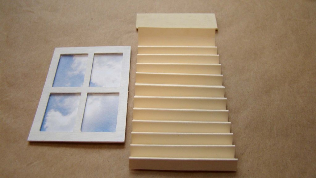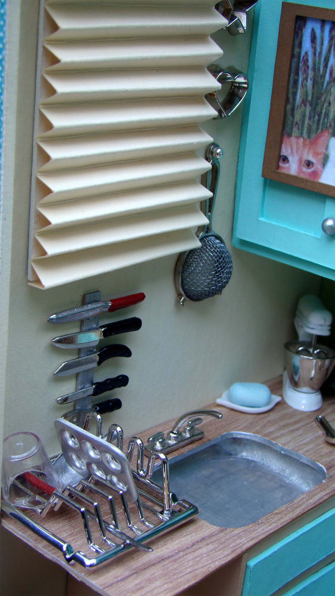 The kitchen window has blinds that I made by cutting a section of a manila folder the same width of a 4 Panel Rectangular Window then scoring it into pleats. You can’t really see the sunny blue sky outside with the blinds on top but that’s OK… I know it’s there.