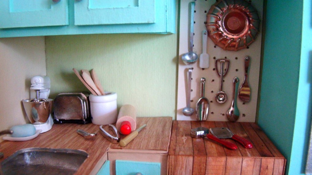 The pegboard above the stove stores pot lids from my stash, a Meat Cleaver Charm, Mini Working Scissors and the whisk from the Mini Wooden Spoon & Wire Wisk Set.