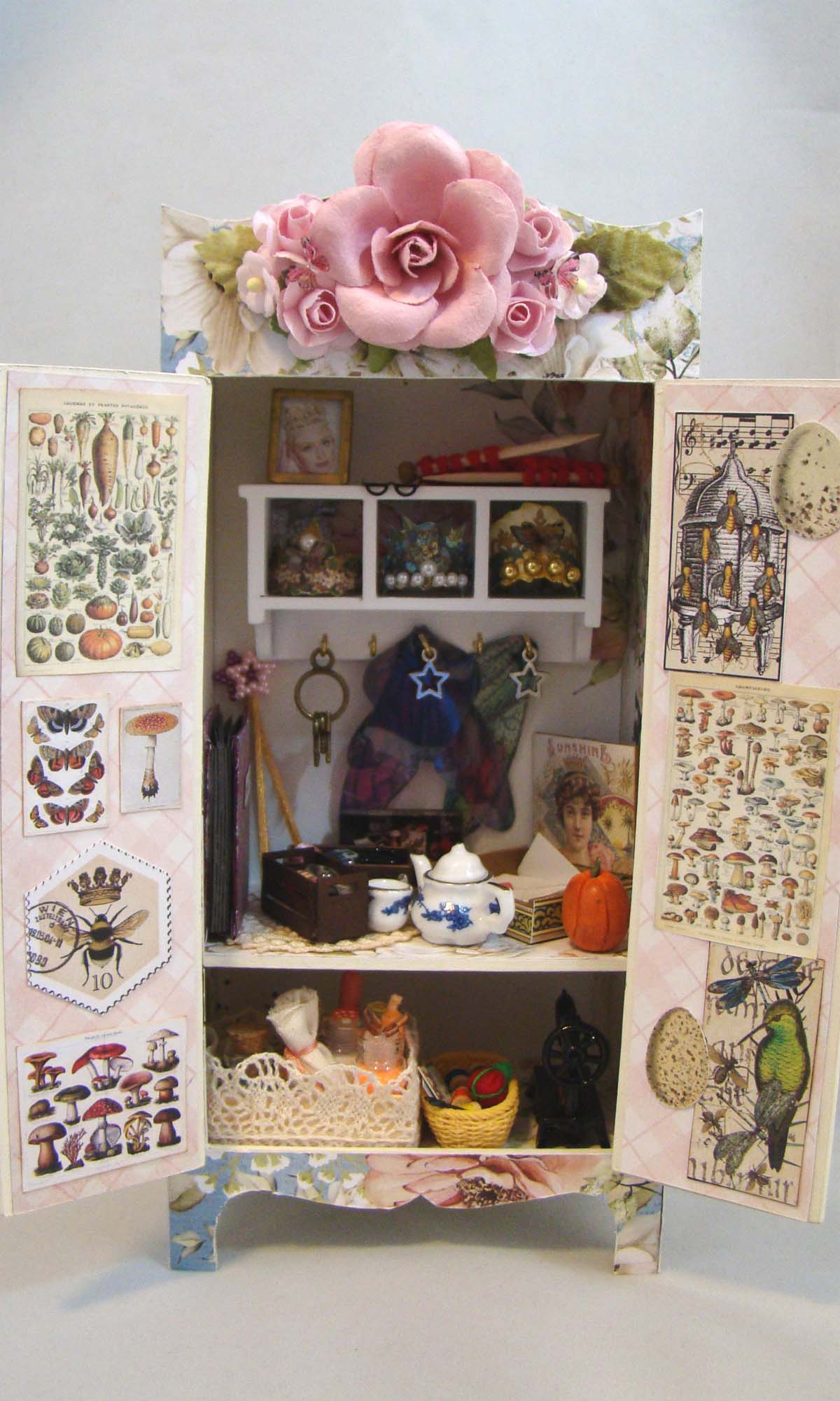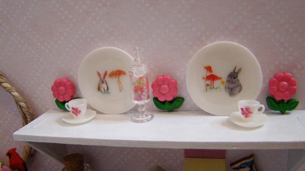 The top shelf holds some charming bunny plates nestled between decorative pink flowers which are just plastic buttons with the shanks cut off. I added a Fancy Candy Jar with Candies and some demitasse cups made from White Plastic Cups & Saucers decorated with floral nail art decals.