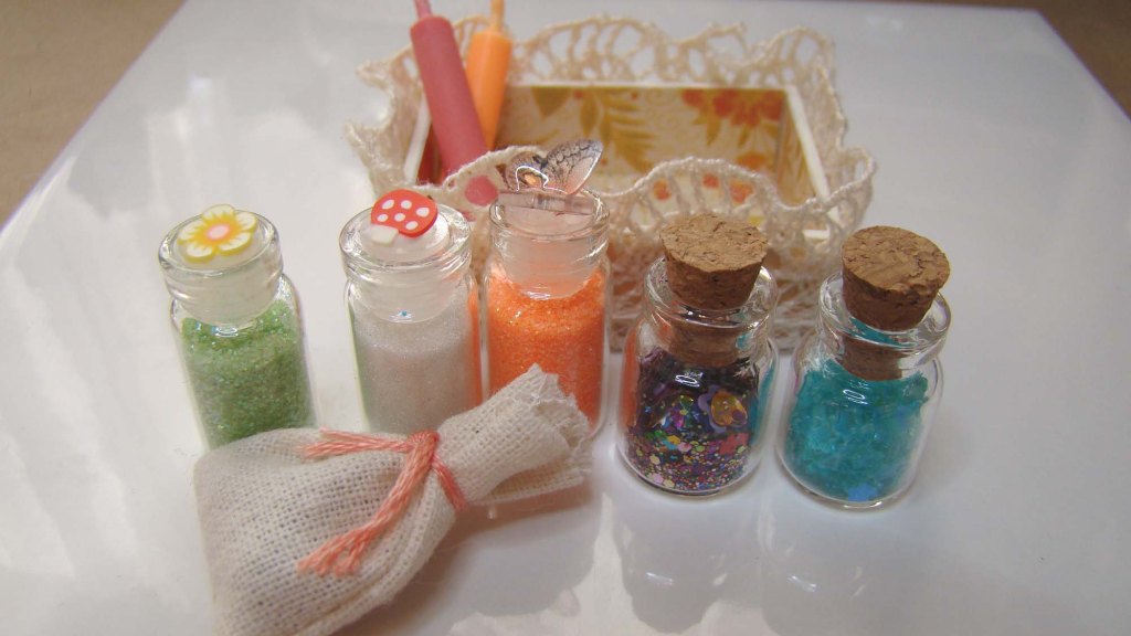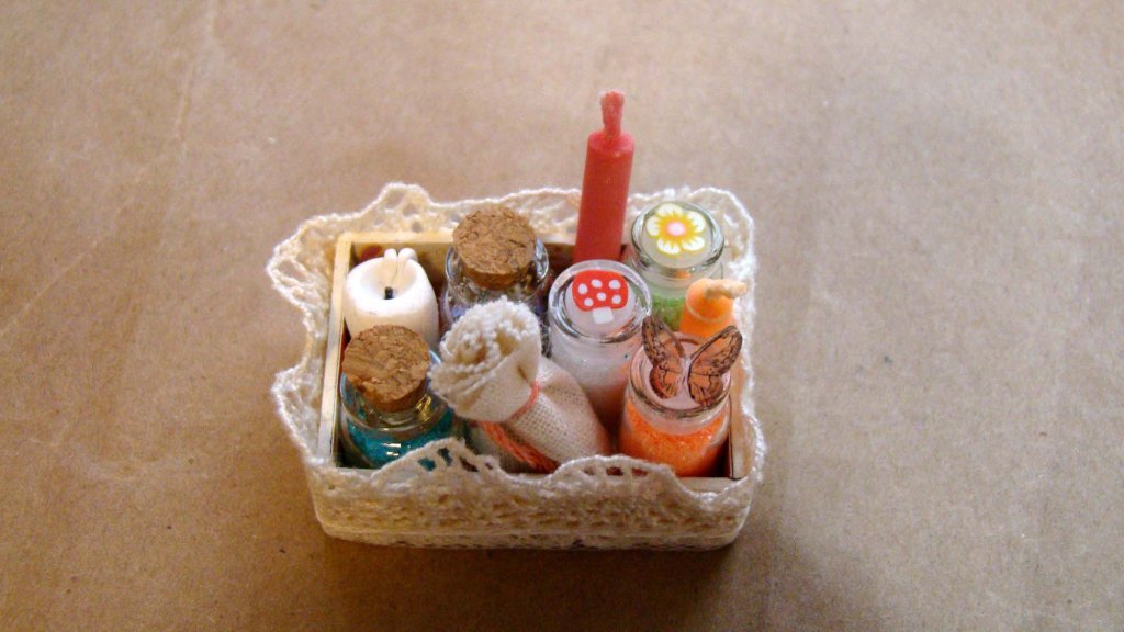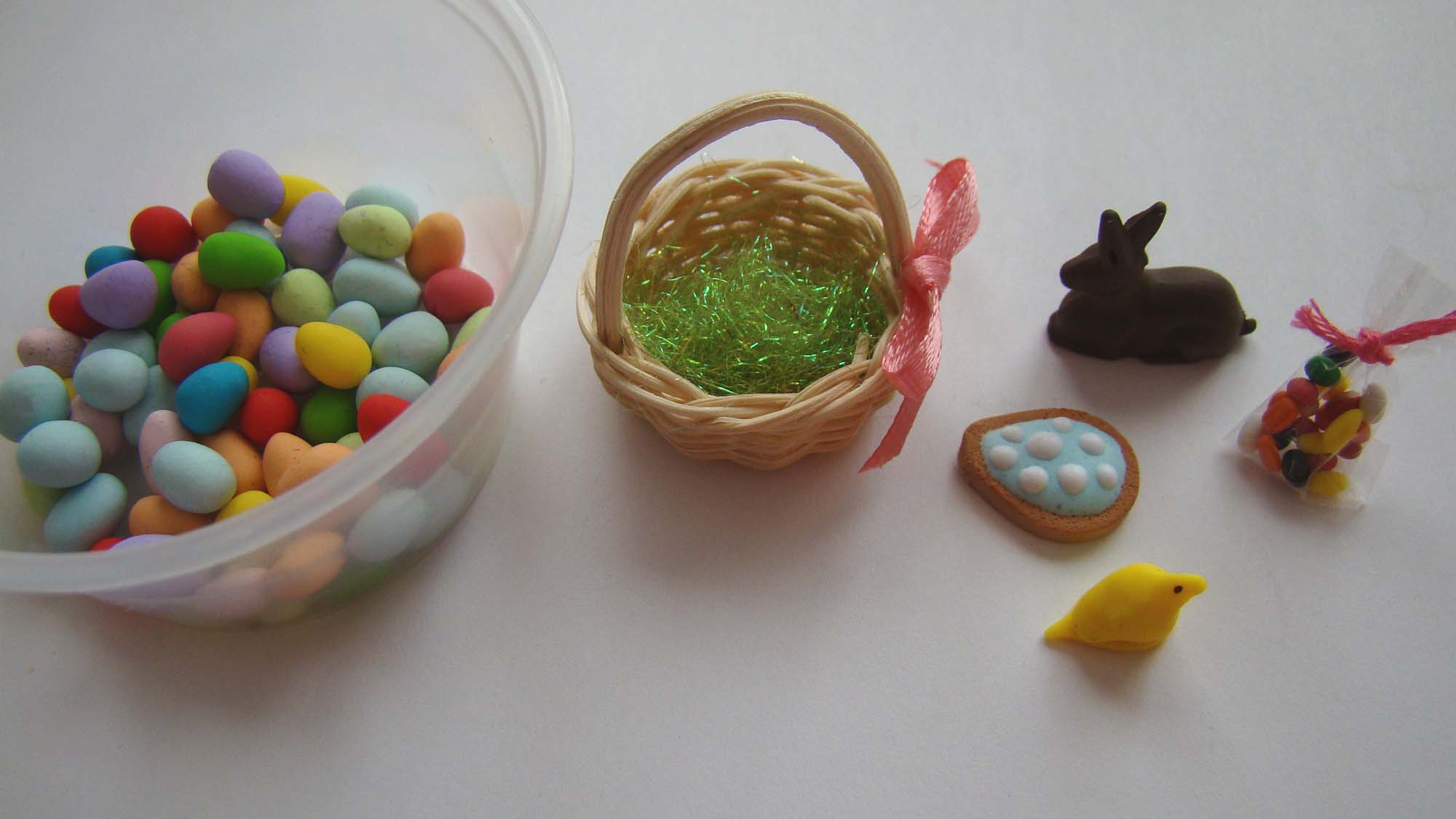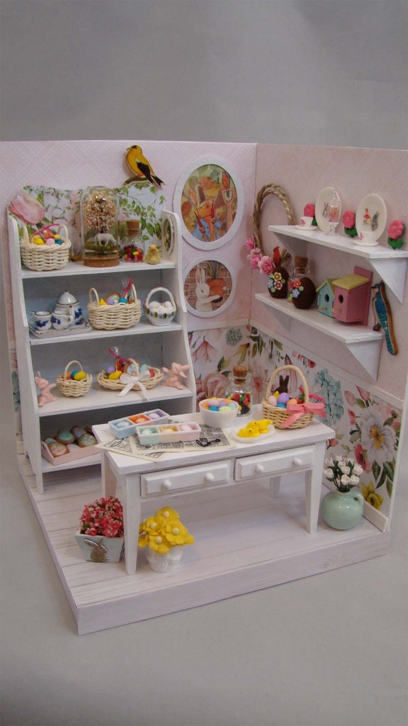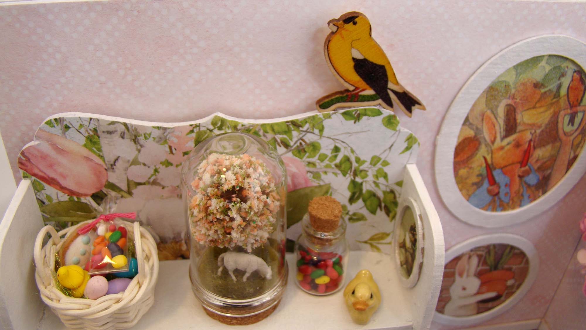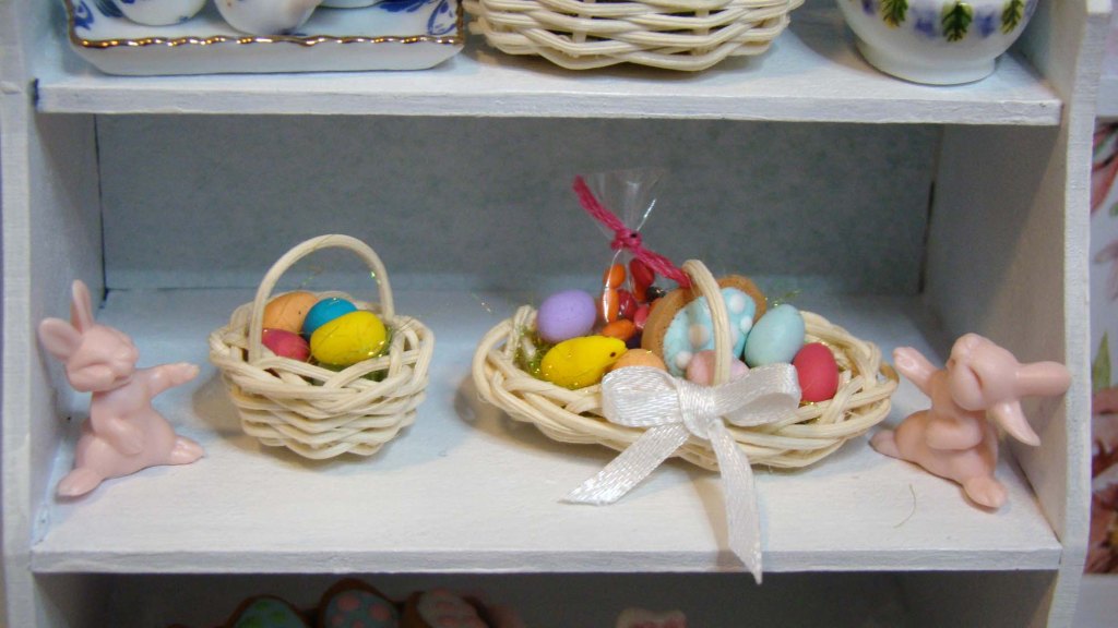 The bottom shelf has chocolate eggs I made from polymer clay and decorated with Bright Flowers and Minty Cool polymer clay slices. There is a Tiny Glass Bottle full of polymer clay jelly beans, a Tiny Bird House and a Tiny Bird Box.