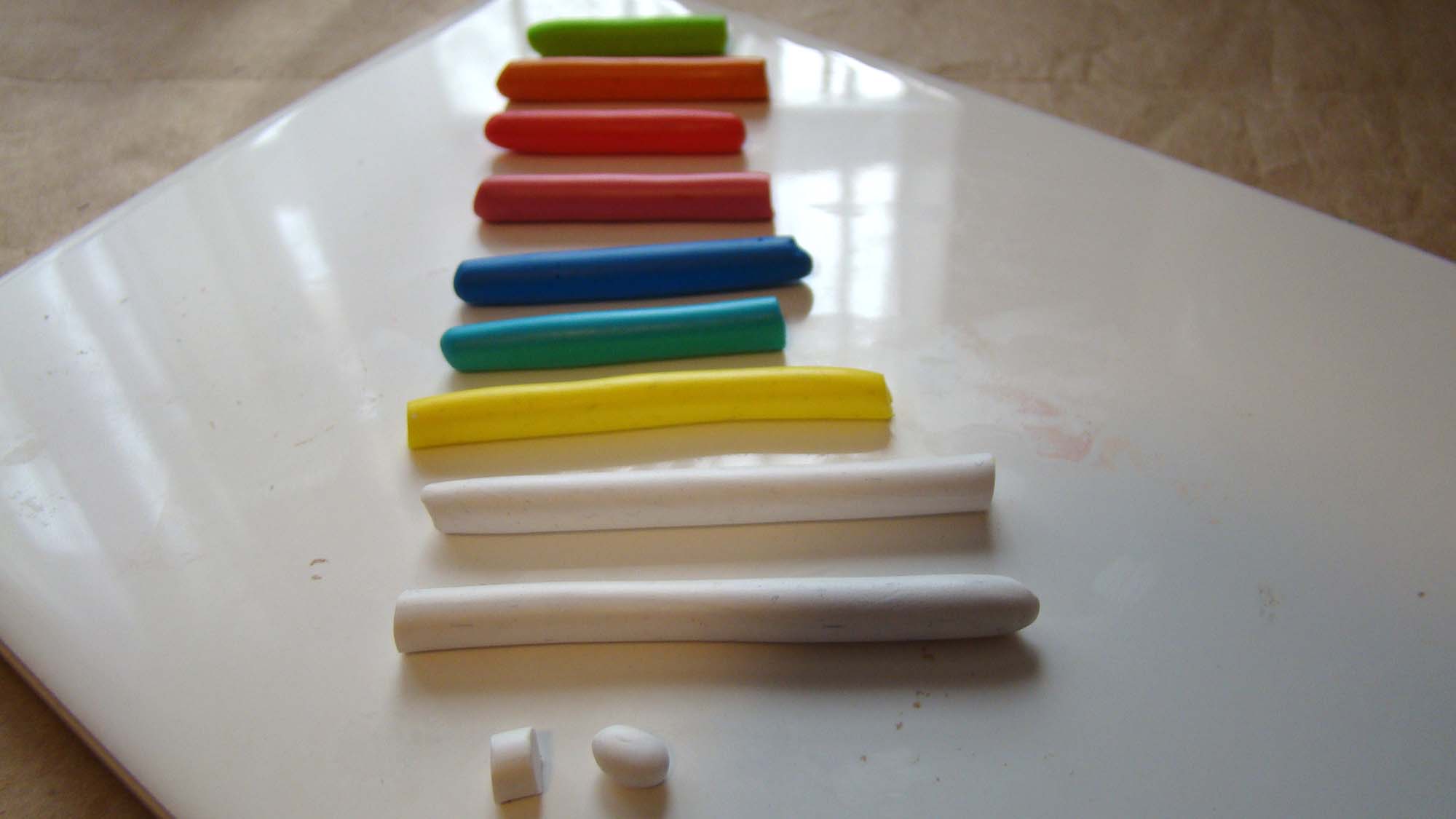 To make the eggs I started with rolling clay colors into ropes then slicing making equal sized slices that eventually got rolled into egg shapes in the palm of my hand. I used this same technique to make the jelly beans but on a much smaller scale!