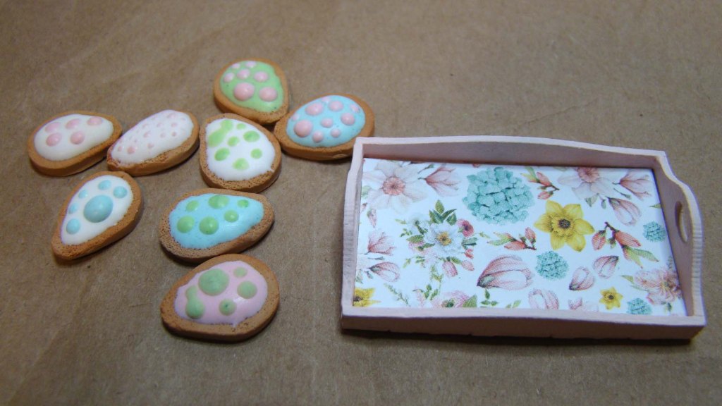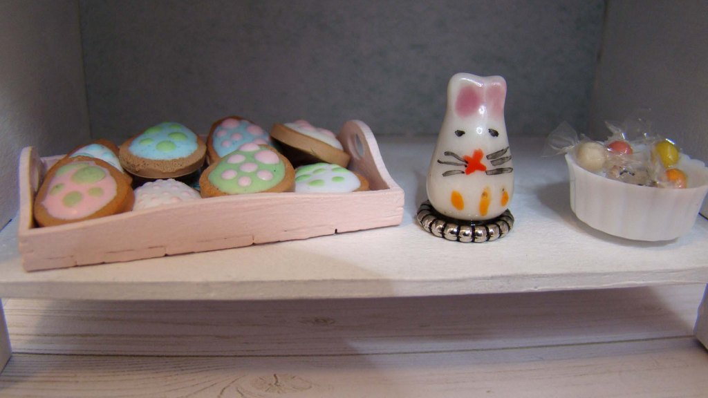 Besides that tray of cookies, the bottom shelf holds a bunny figurine which is just a porcelain bead glued onto a metal base and some Tiny Wrapped Gumballs in one of the White Plastic Mini Serving Dishes.