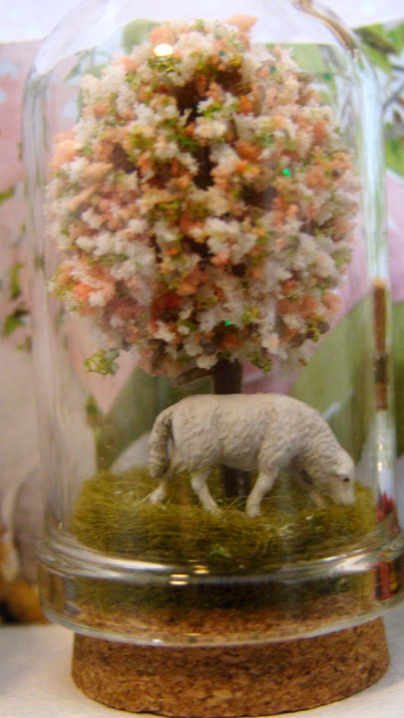The pastoral bell jar scene is made from an HO scale sheep and tree set inside a Tall Glass Cloche with Cork Base.