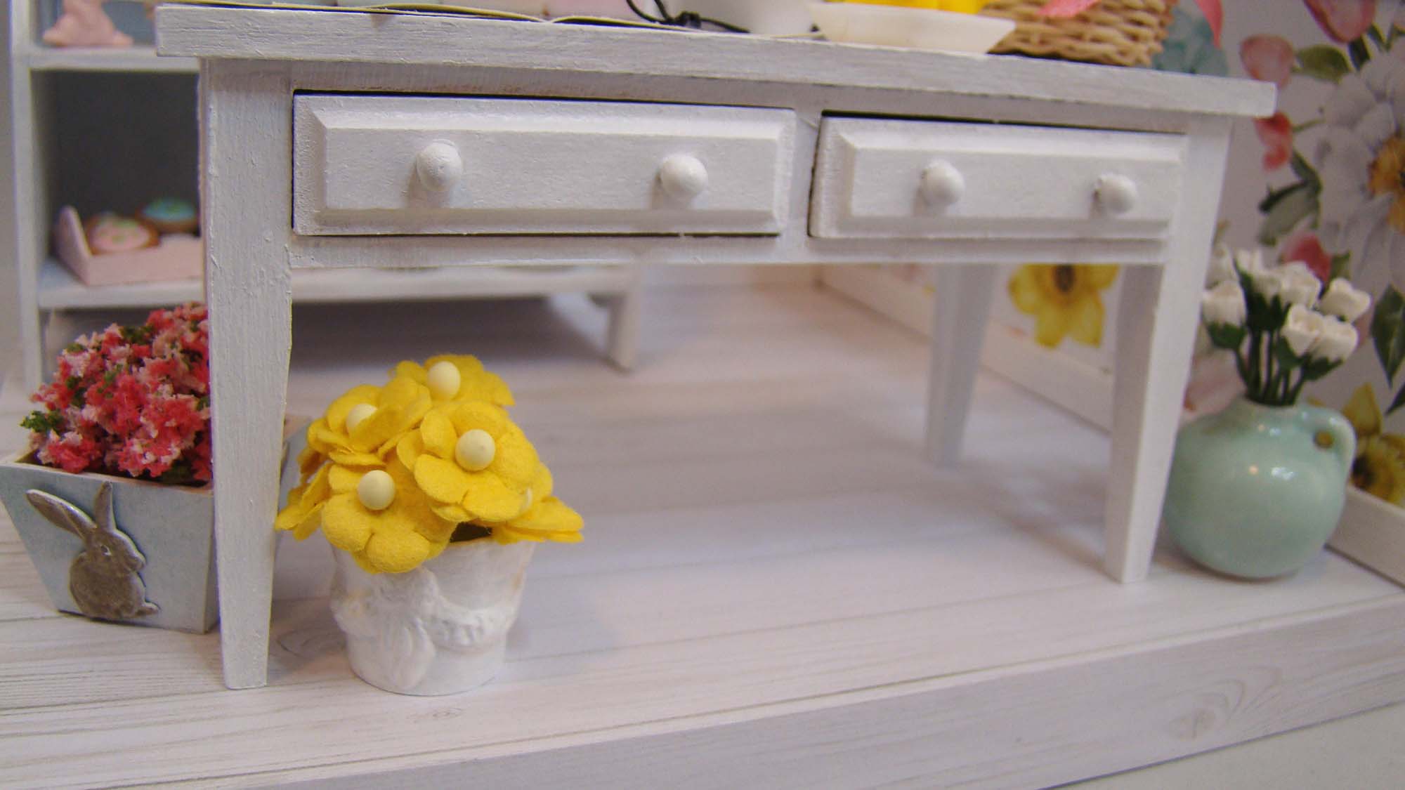 Below the table are a few floral displays. There is a Plant with Pink and Fuchsia Flowers tucked into a Square Wooden Planter decorated with Rabbit Brads. The Tiny Yellow Mulberry Blossoms sit inside one of the Miscellaneous Flower Pots painted with white nail polish. Finally is that gorgeous Aqua Ceramic Jug filled with Mini White Rose Buds.