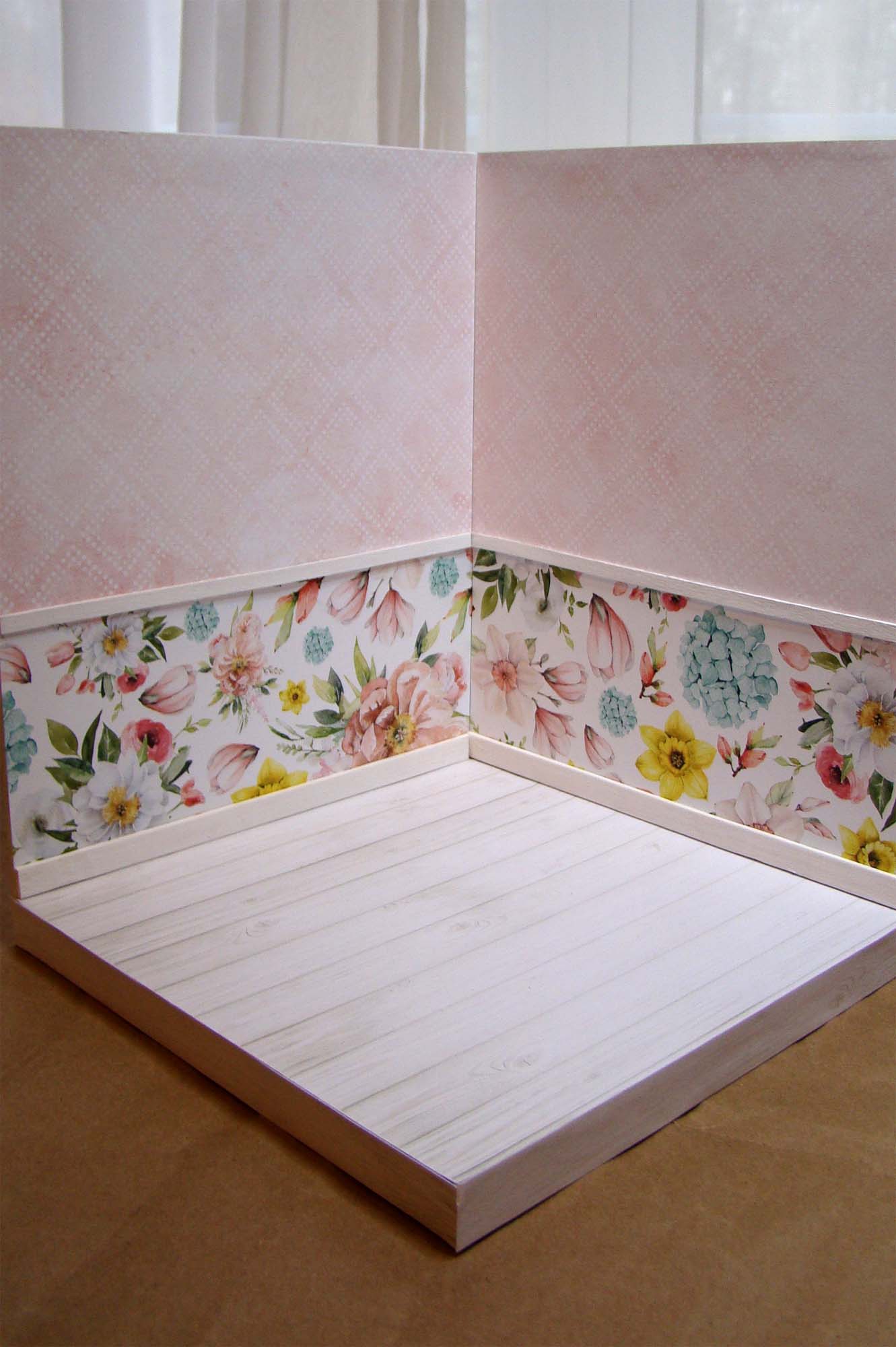 These Beauty in Bloom papers just scream springtime. The white wooden floor was a paper from my stash. The baseboards and chair railing are painted craft sticks.