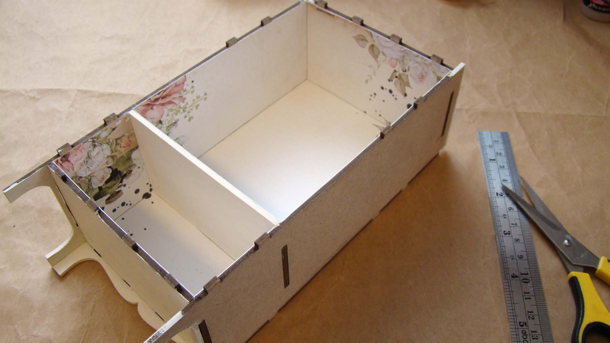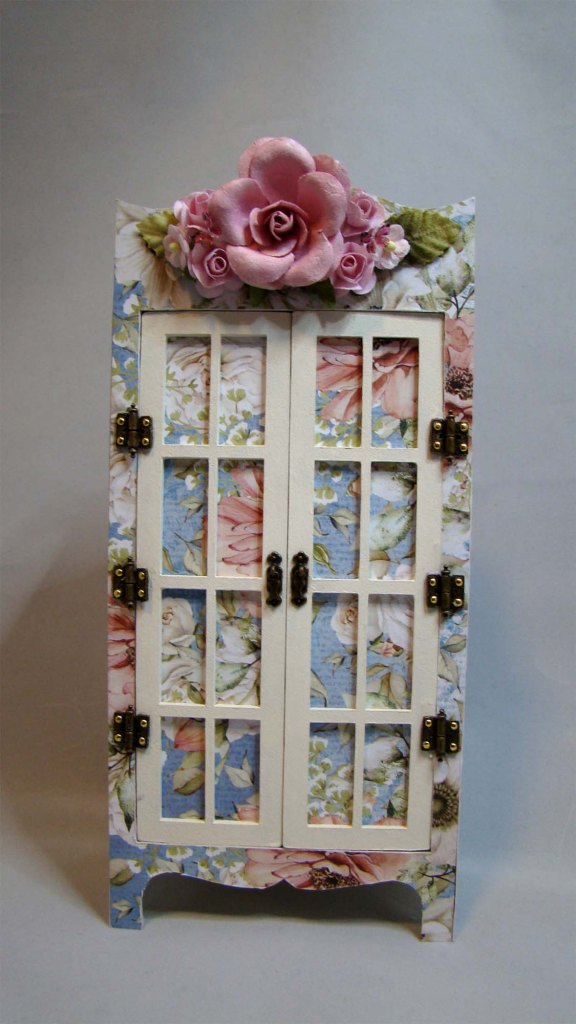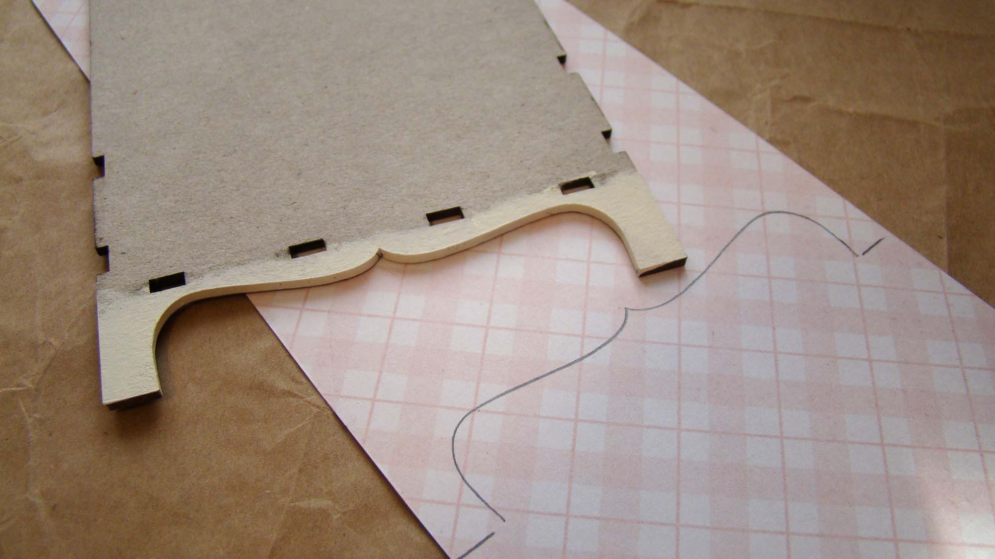 I used a Small Trinket Shelf Stand to display the finished baskets. It comes with a drawer that fits at the bottom. I chose to leave it out in order to give myself more room to display everything. Before assembling it, I used the rear wall as a template for the paper on the top shelf.