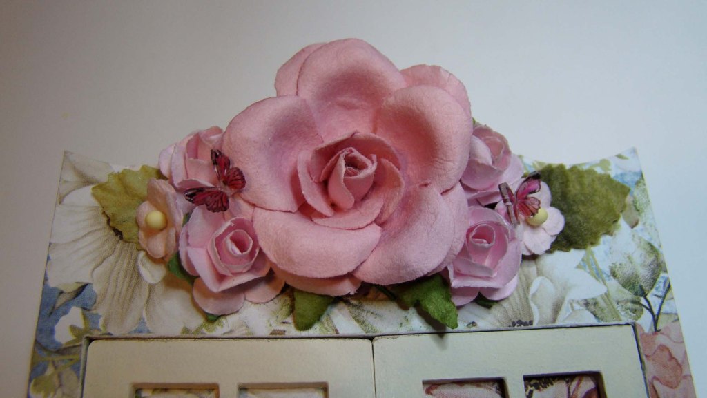 Tiny Paper Roses and Tiny Mulberry Blossoms were glued on. The final detail was the addition of a Cardinal Brad.