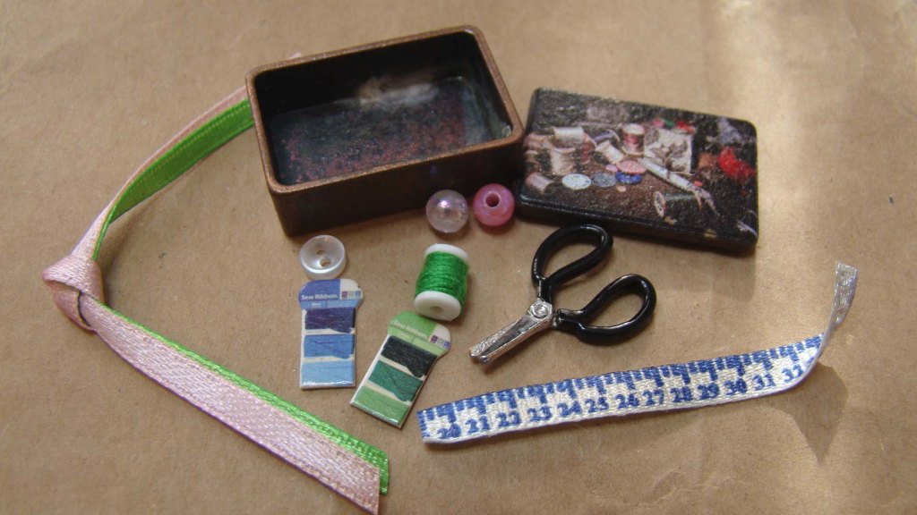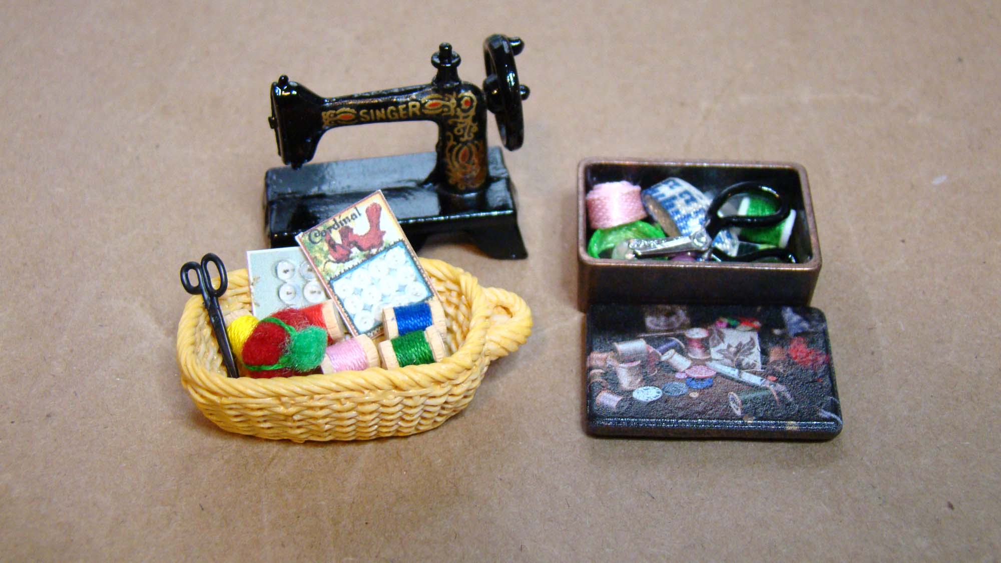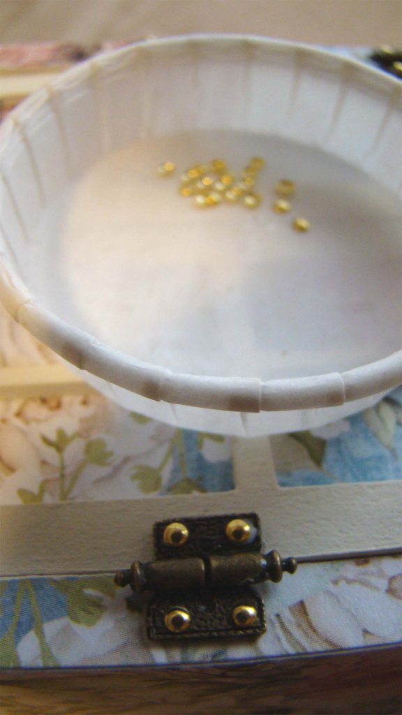 The main action in this little scene takes place on an Unfinished Console Table I painted white. The egg dyeing happens on some Miniature Newspapers. I made the egg holder from a bit of thin black wire. All of the dishes used here are also from the White Plastic Mini Serving Dish Set.