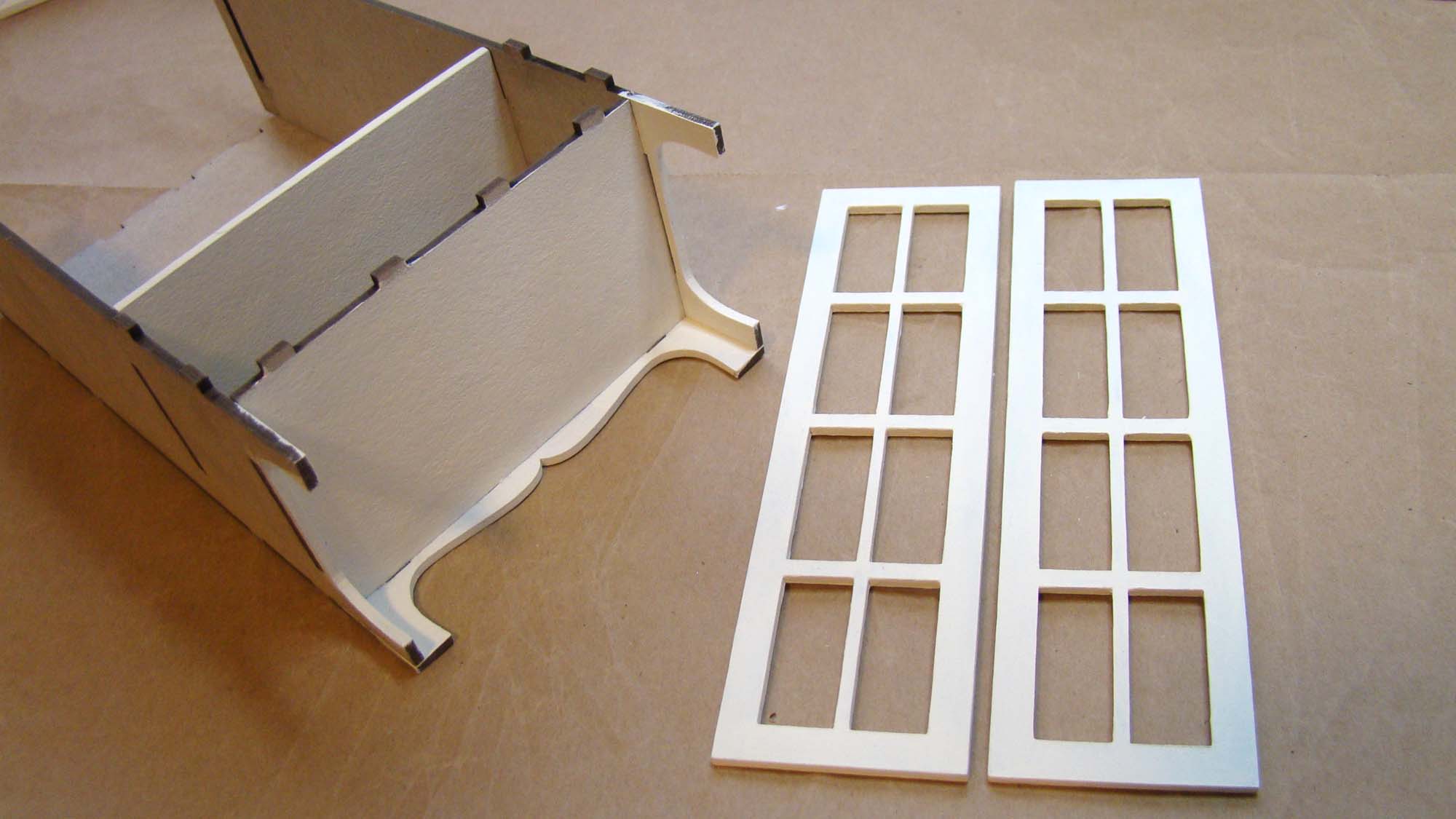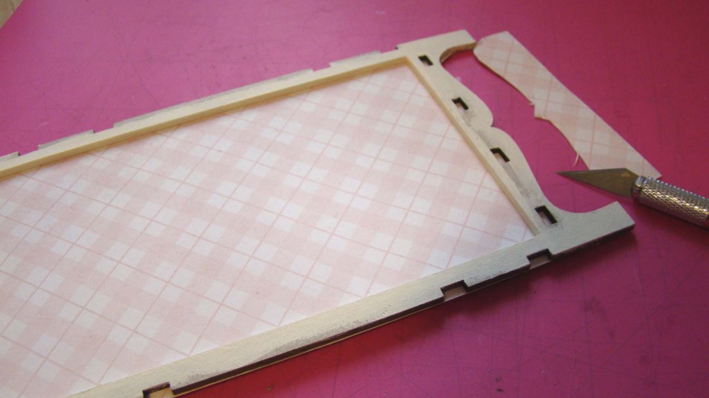 After assembling the room box using tacky glue, I painted the edges and corners with a white acrylic paint. Painting the corners helps camouflage any slight misalignments I might have when the paper gets glued on.