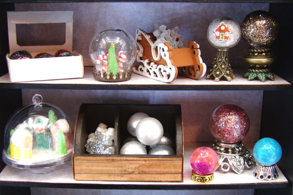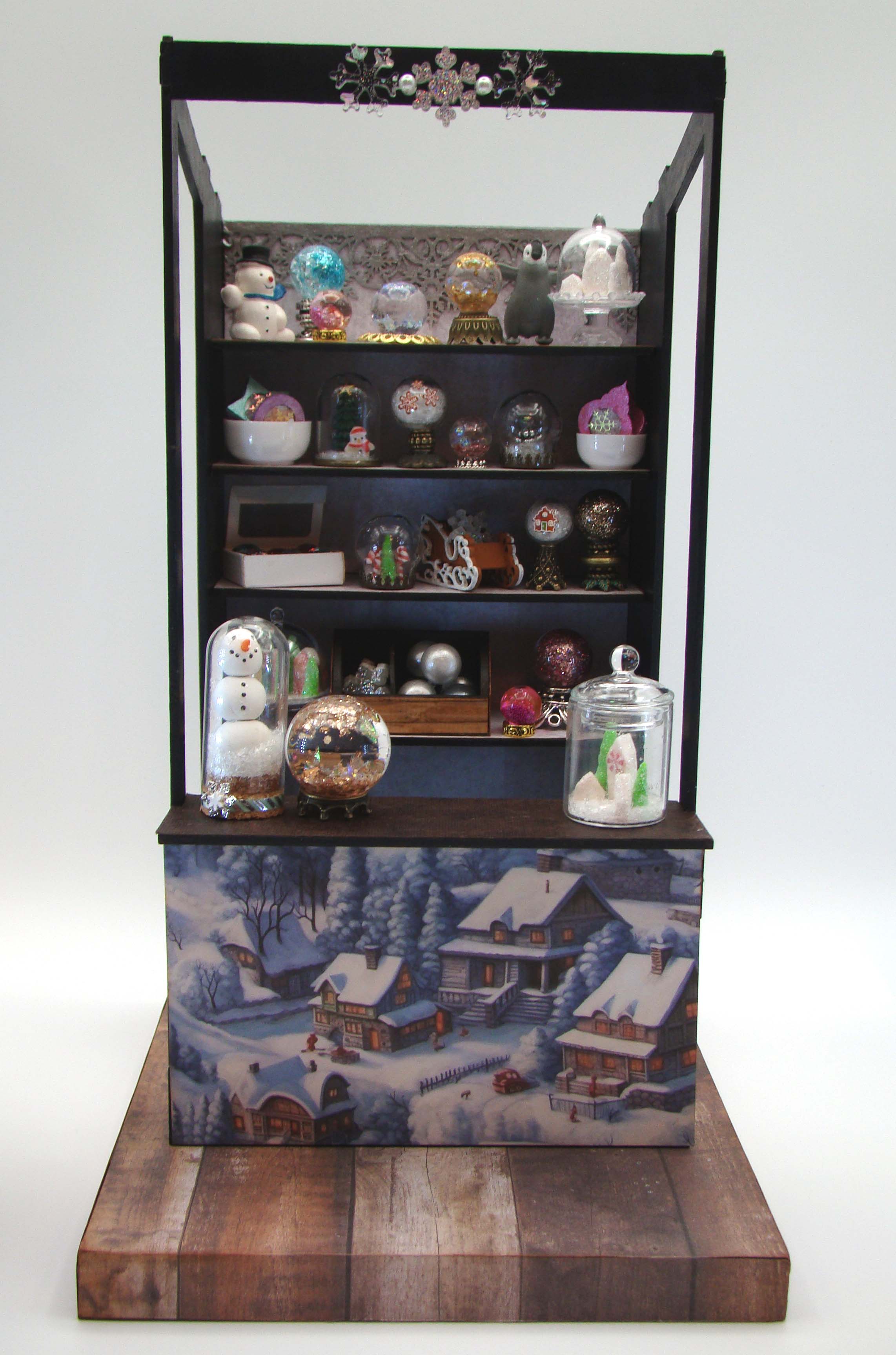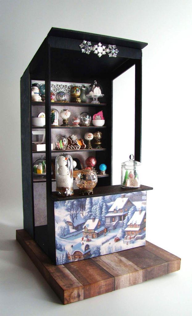 Here come the holidays! It won’t be long until snowy weather hits and we have our homes decked out for all the winter festivities. I’ve never been to any of the European holiday markets but can visualize a diverse mix of multicolored booths each one selling prettier things than the last to make your holidays bright. In that spirit I have a miniature holiday market project for Alpha Stamps to share with you today, one that features a 1:12 Scale Market Stall and a bunch of snow globes, ornaments and other tiny sparkly bits.