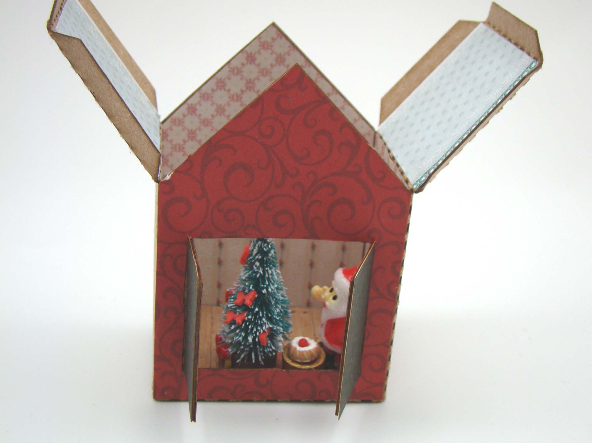 There are also new larger foldable 2 Inch House – String Tie Doors which open in the front. Behind those doors you can set a mini scene or just tuck in a couple of treats. For this one I wanted to set a Christmas eve scene inside so decorated the interior with wallpaper and flooring from the ¼ Scale Wallpaper Collage Sheet.