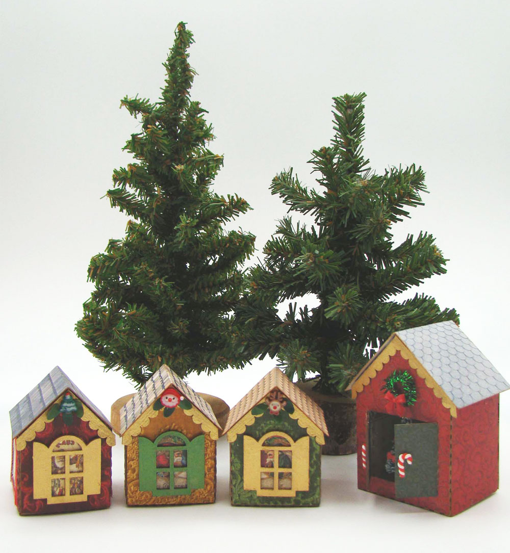 I used the Storage Chest Labels Half Sheet for St Nick images to go on the sides of the houses. Those images were framed using Dresden Christmas Borders trim. The Storage Labels sheet also had some tiny Santa images that fit nicely behind some of the smaller Mini House Doors & Windows which got a coat of metallic acrylic paint.