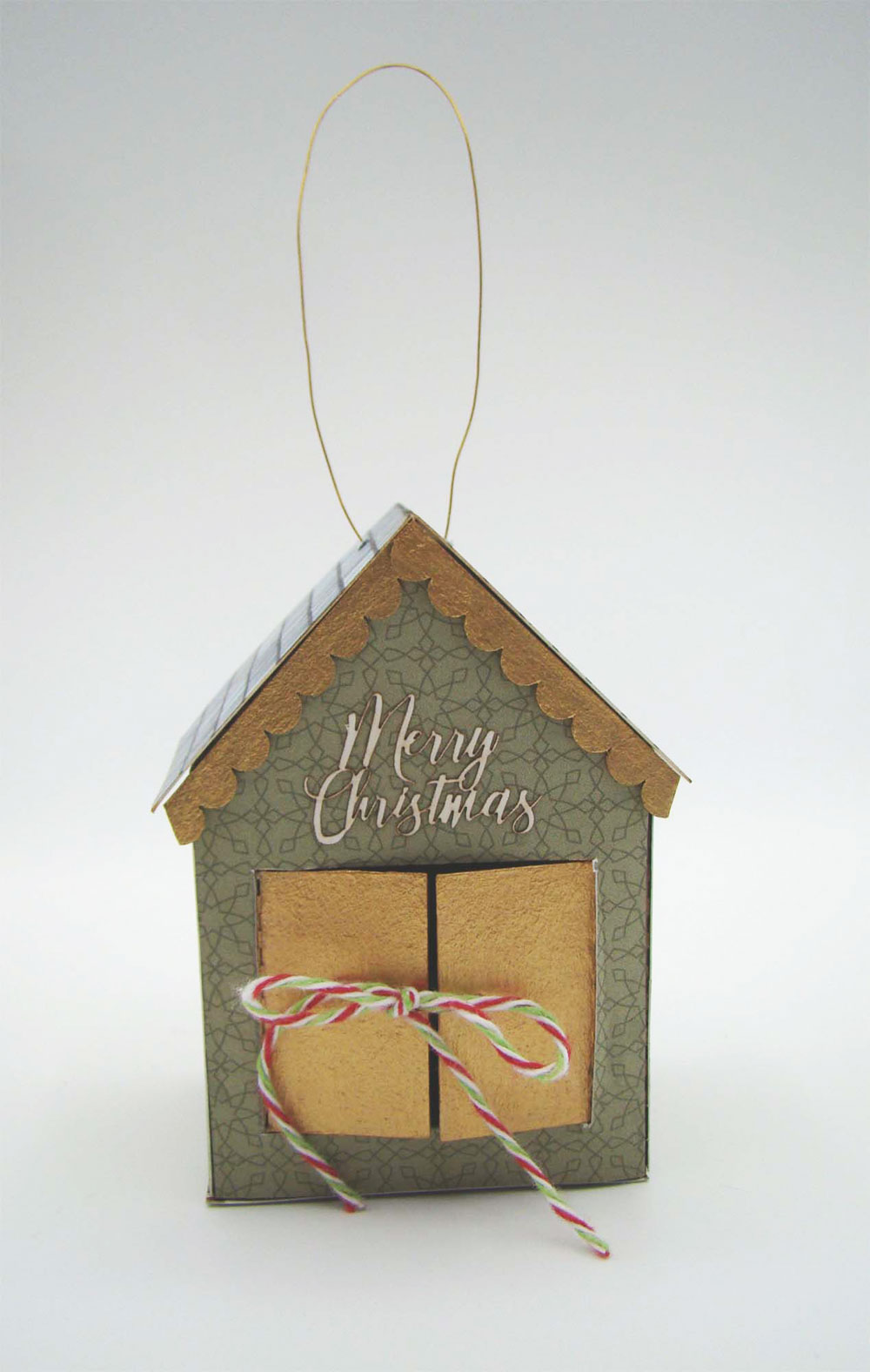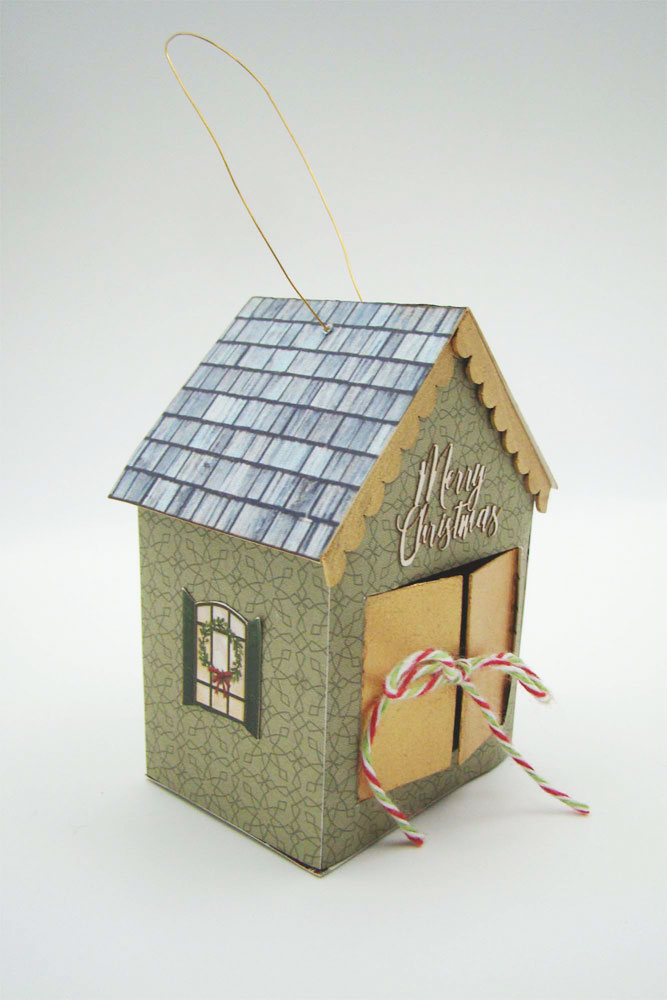 I turned one of the 2 inch houses into an ornament. The paper is from the Vintage Christmas paper pad. The doors were painted gold before adhering paper to the front. There is one of the Tiny Holiday Greetings above the doors along with more Tiny Scalloped Shingles. This house comes with holes in the roof for the addition of a bit of wire to hang the ornament and also holes in the doors to run some holiday baker’s twine through to tie the doors shut after tucking some treats inside.