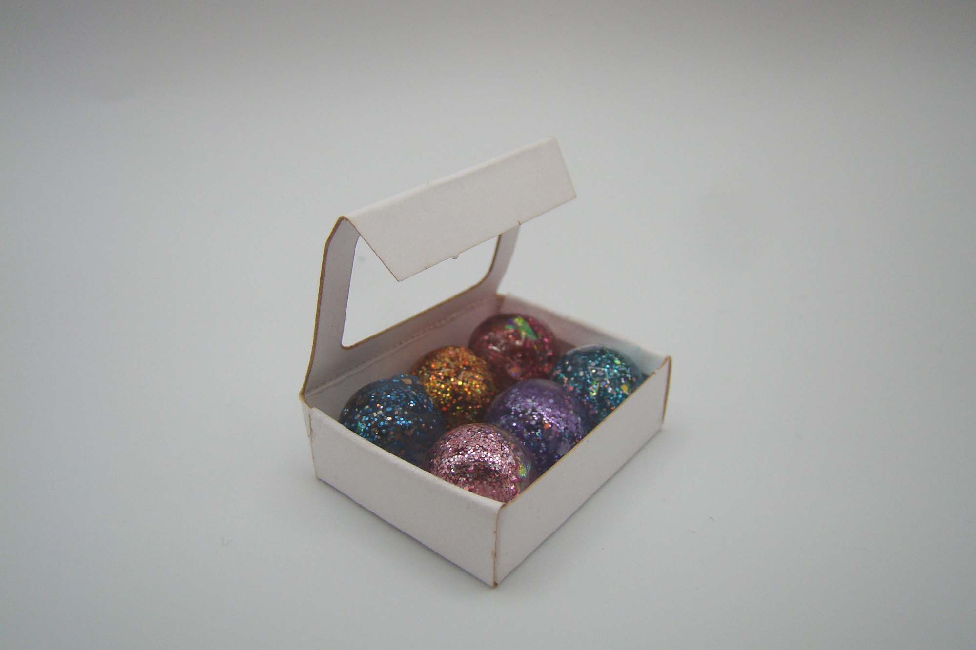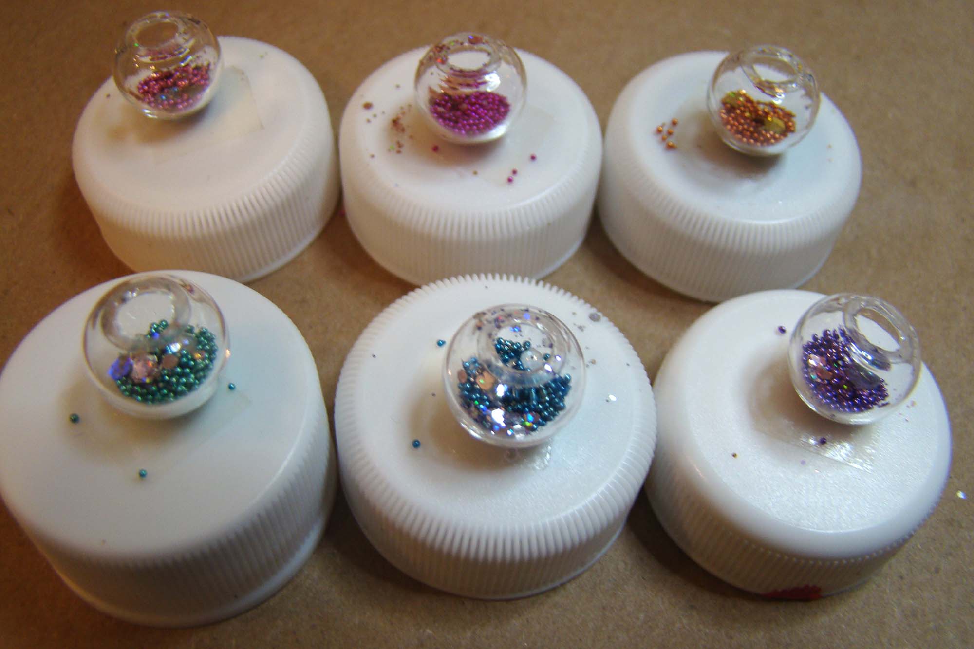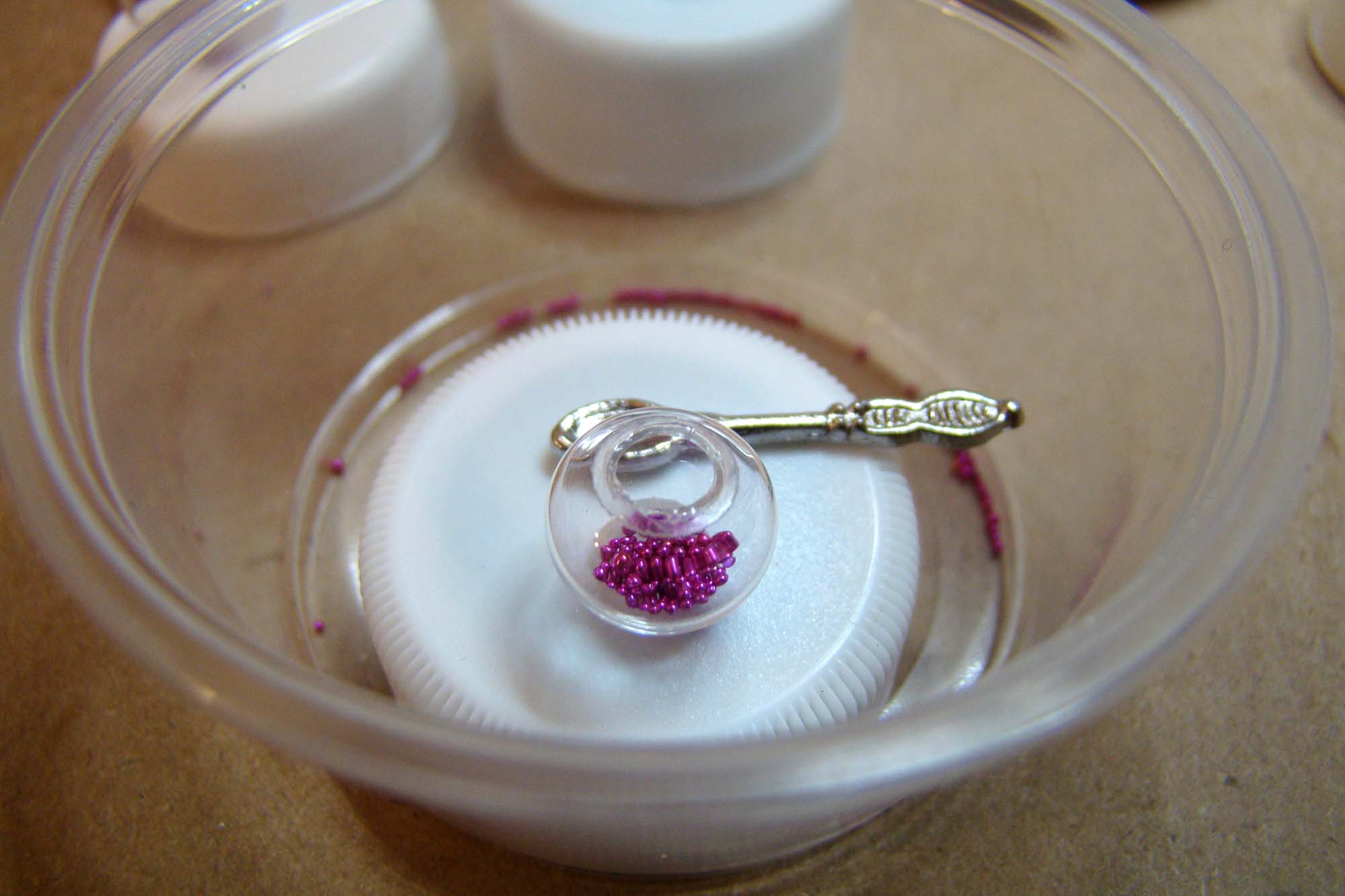 They’re made from 1cm Clear Glass Globes that were embedded with microbeads, colorful glitter, Iridescent Water Bubbles and Iridescent Mylar Flakes set in resin. Here is the set-up I used to keep the mess down while working with the globes. The small plastic cup helps catch any spillage from the fillers. A dollhouse spoon actually helped the process of filling the globes.