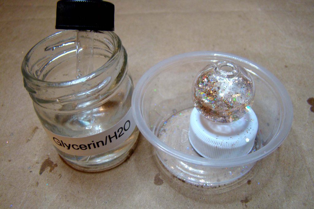 The basic idea is to mix glycerine and water in a 1:1 ratio, add a bit of rubbing alcohol and use an eyedropper to suspend whatever sparkly mix-ins you want before sealing your globe container with resin and curing under UV.