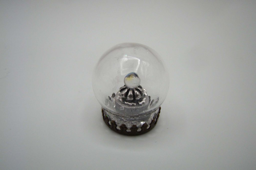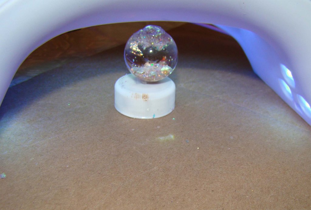 The second method is to make a ‘lid’ by dropping a small of resin onto plastic and curing it under UV light as shown below. This hard resin lid gets attached by applying liquid resin around the globe’s opening (I use a toothpick for this), setting the lid on top then curing under UV. I always go back to add another coating of liquid resin or two over the entire lid and cure again to make sure there are no leaks.