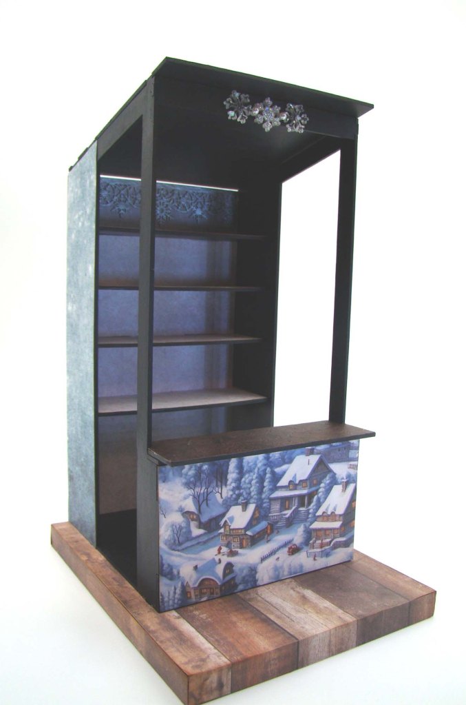 Let me start by saying the market stall is easy to put together using a bit of tacky glue. I always lay out a structure so I know which surfaces will need to be painted and which will be papered. I chose a dark blue acrylic paint for the roof, floor and supports and Craft Consortium Dark Grunge Tone papers for the shelves and exterior walls. To add a little bit of sparkly interest to the very top shelf, I painted a Snowflake Border with silver paint and adhered it to the rear wall.