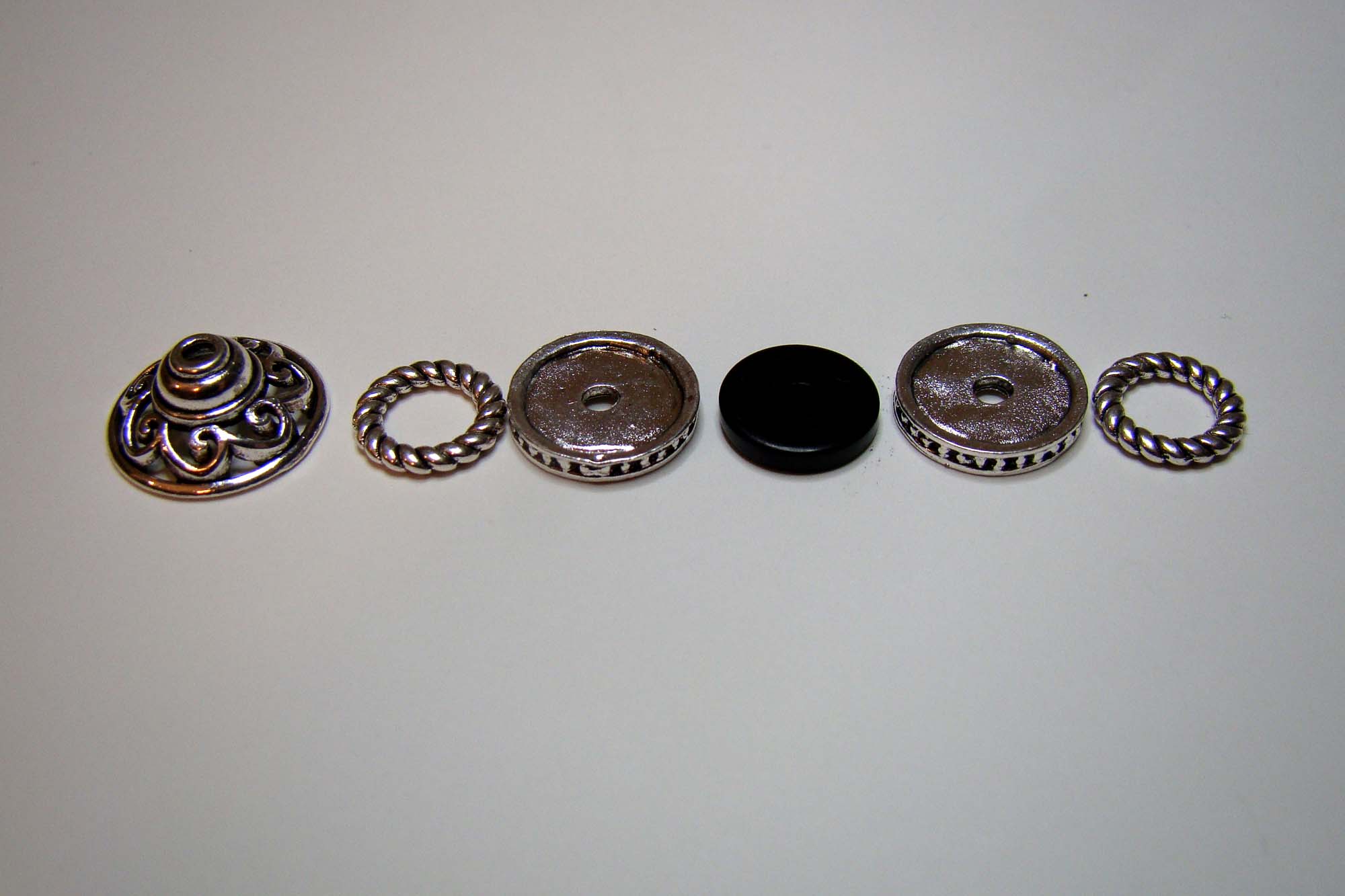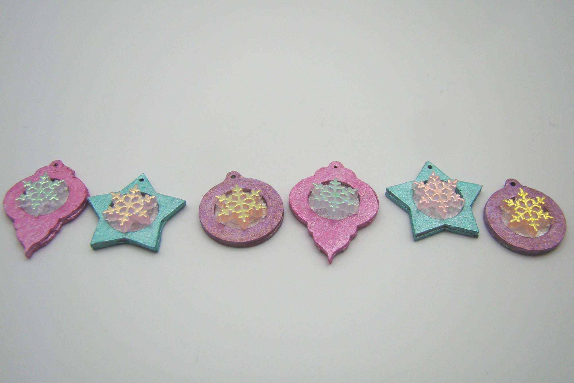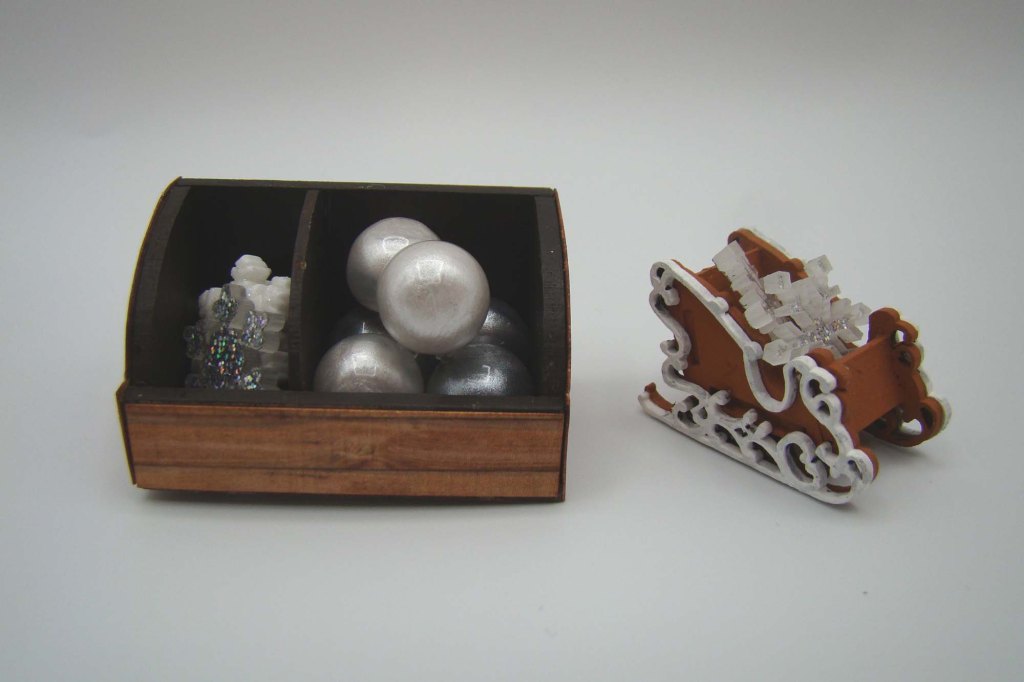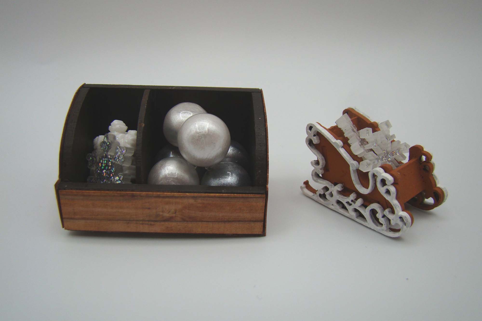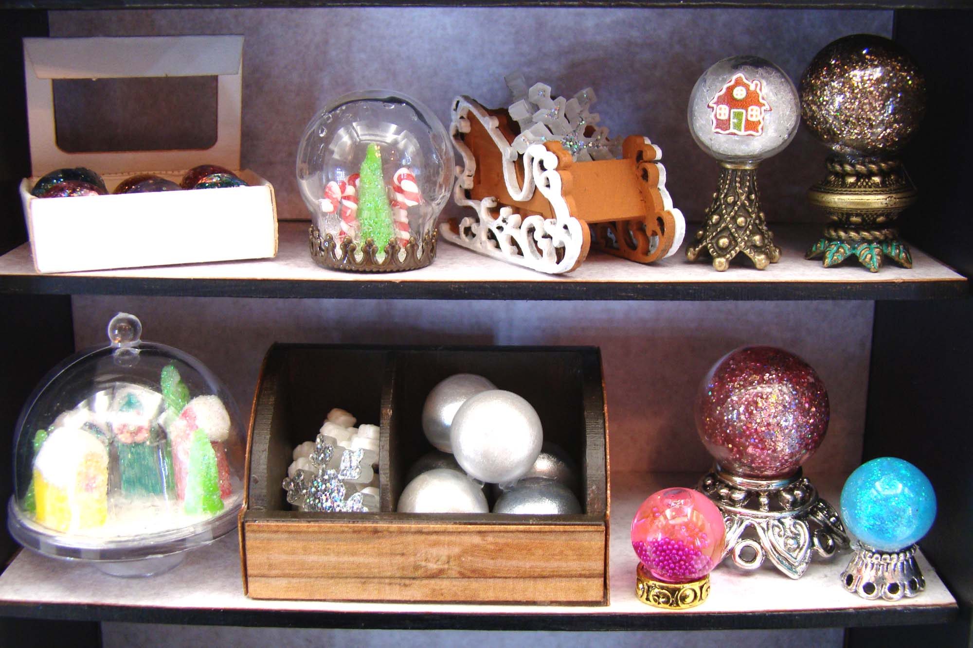 To display them I assembled the new 3 Sections Curved Display. The interior was painted brown and the exterior covered with a scrap of woodgrain paper. This piece comes with two dividers that can be glued in place wherever you want them. I elected to use just one of them. The pearly globes went on the right and a few of the 18mm Acrylic Snowflakes on the left all to be sold as ornaments.
