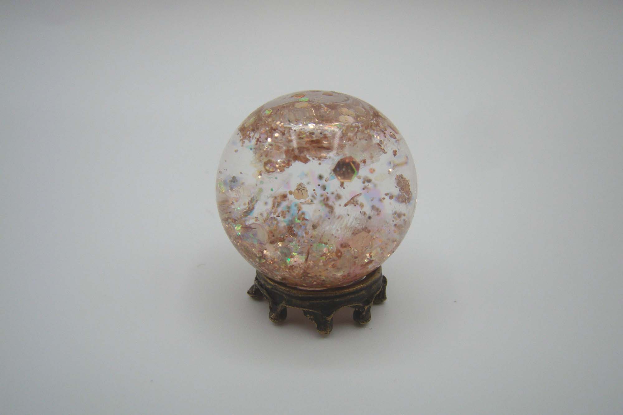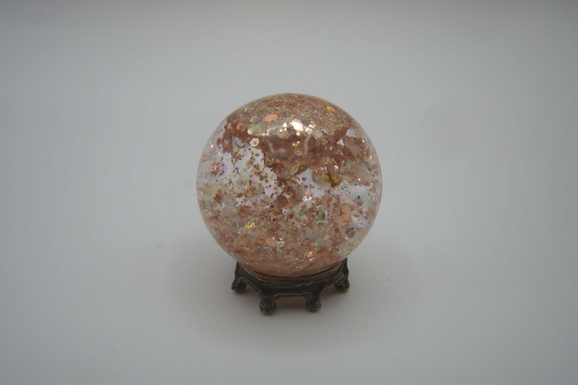 Not interested in dealing with liquids? Just use resin without them. The final project won’t swirl when you shake it but if you just want something sparkly to sit on a shelf it probably doesn’t mater. Add your mix-ins, fill the globe with resin, give it all a good stir with a straight pin and pop it under your UV light.