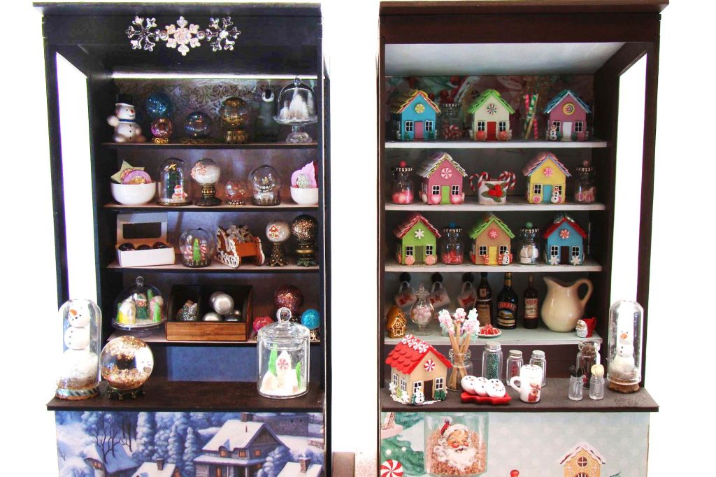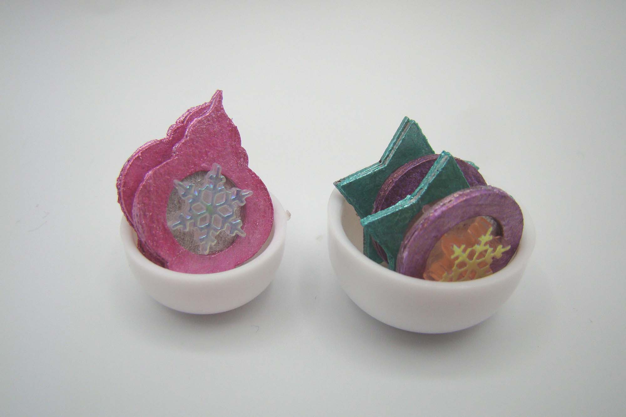 A few of these contain my version of a miniature glitter village, which started with house shapes cut from polymer clay using an x-Acto knife. I made some plain white and others different colors with a thin layer of white clay ‘snow’ on the roofline.