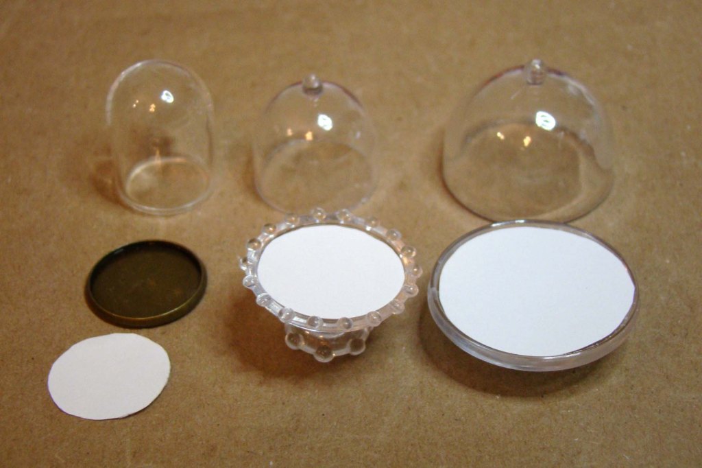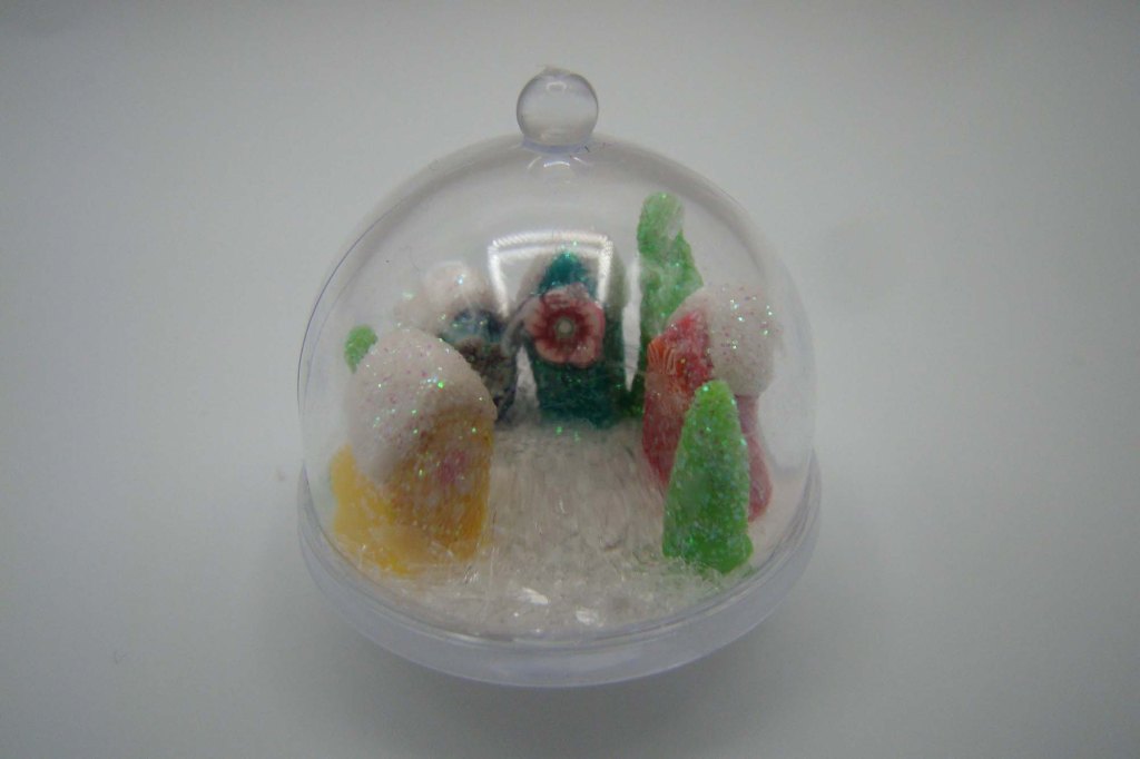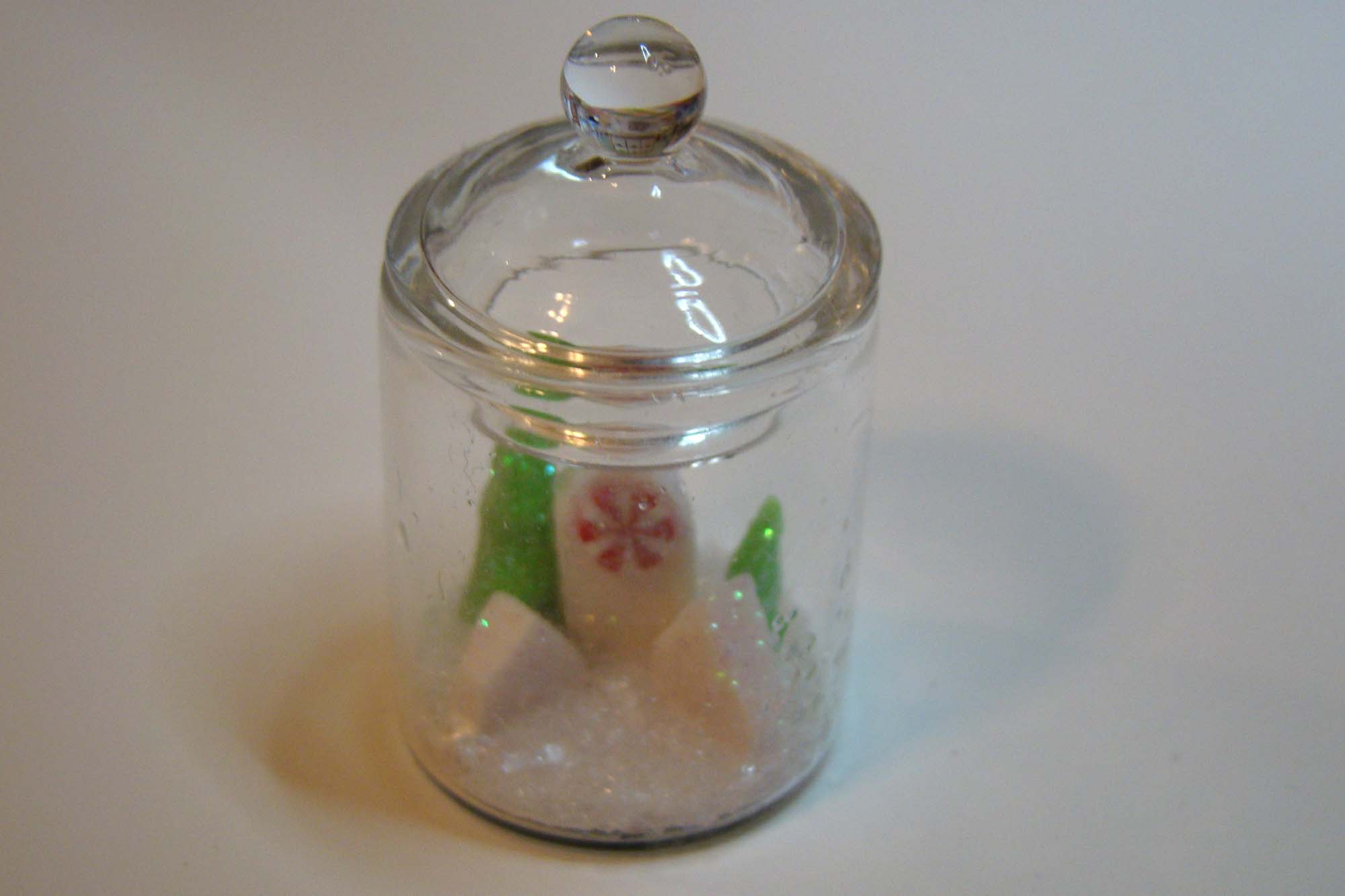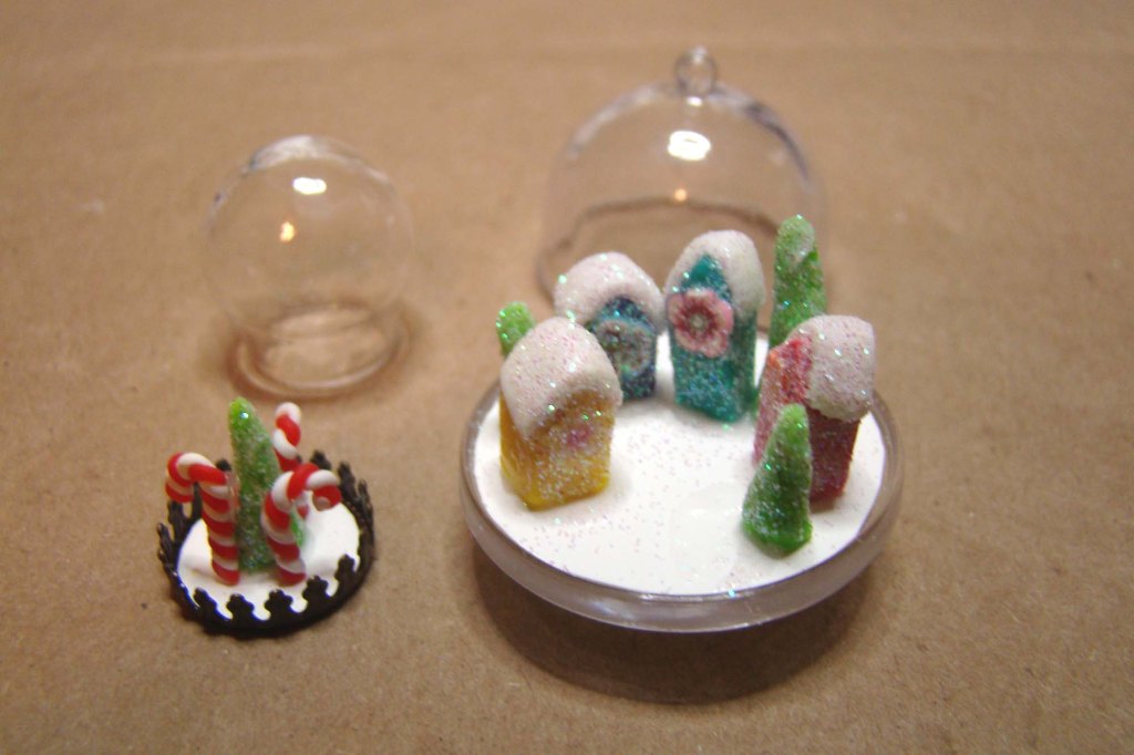 Here are two little scenes mid-assembly. The one on the left is a glitter tree surrounded by a couple of Tiny Polymer Clay Candy Canes that sit inside a 15mm Round Glass Globe Dome. On the right is a colorful glitter village in one of the new 3 cm Tall Clear Cake Stand or Domes.