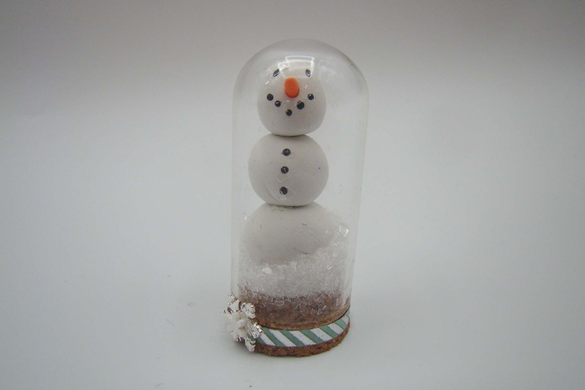 Here is a polymer clay snowman I made to fit inside a Tall Glass Cloche with Cork Base. The carrot nose was stiffened by baking it for 5 minutes before inserting it into the snowman’s head. The base has a bit of decorative trim and one of the Tiny Silver Snowflake Mix topped with a white snowflake from the Blue Penguin Polymer Clay Slice Mix. I love to use slice mixes in my crafting and find myself coming back to them project after project to use bits and pieces. This particular one also has tiny pearls and adorable penguins along with blue and white snowflakes.