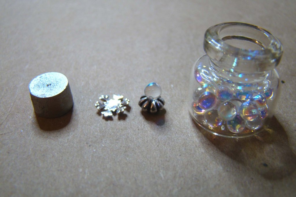 As I was playing around with these little wintery settings I thought it would be fun to put a tiny snowglobe inside a snowglobe. I glued an Iridescent Water Bubble Microbead onto a small silver bead. The stand is a tiny round wood block painted silver and topped with another Tiny Silver Snowflake.