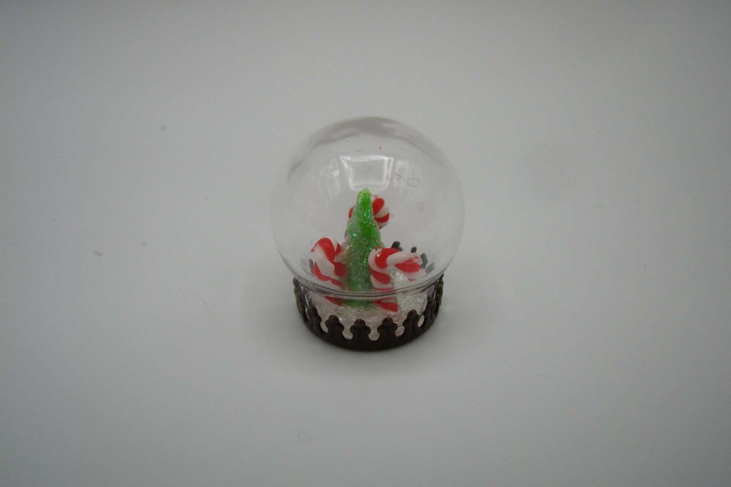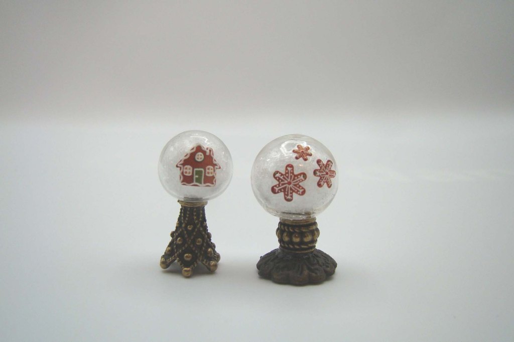 Once I had enough mix-ins I added UV resin until the globe was full, stirred everything well with a straight pin and cured them under UV light per the resin’s instructions. I got the idea for making mini liquid filled snow globes from my daughter who makes dice sets for tabletop gaming. She told me about liquid core dice which my miniature-addled brain immediately thought hey, those might make awesome teeny snow globes. I googled liquid core dice tutorials and found there are a lot of instructional postings and videos available. Here is an example.