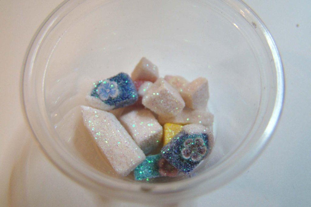 After baking, the colored houses were accented with a Bright Flowers Polymer Clay Slice Mix. To finish them all off they got a thin coating of tacky glue and were tossed into a container of extra fine glitter and left to dry. I also made some white and green polymer clay tree shapes to be included in these little scenes.