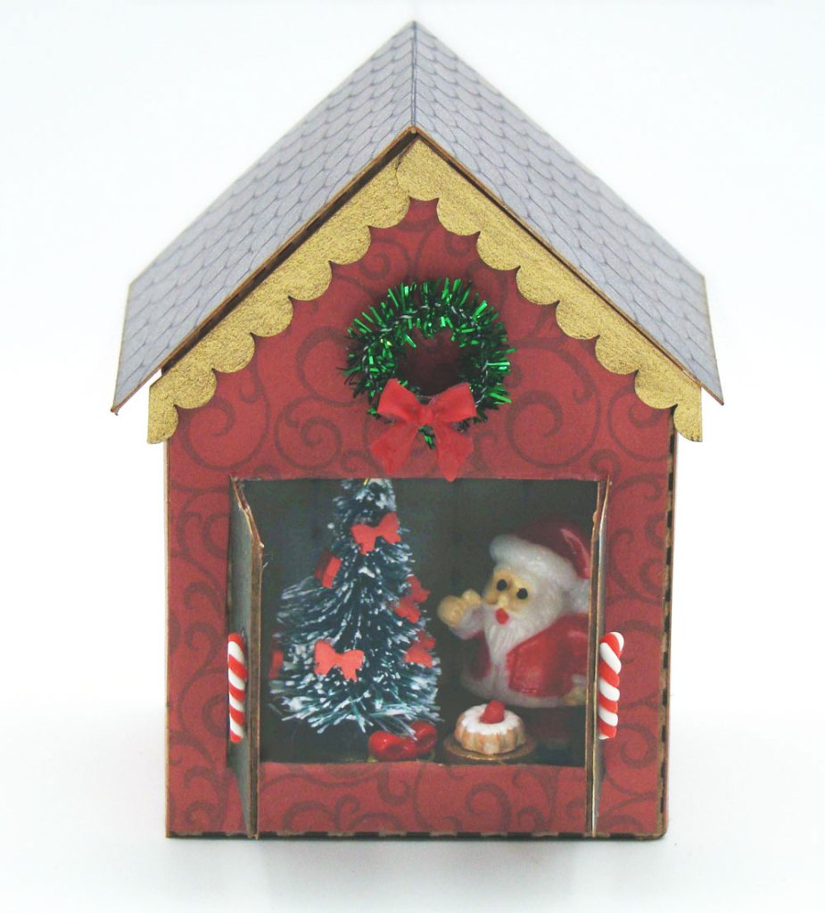 The exterior of the house was covered with A Vintage Christmas 6×6 Paper Pad, more of the Tiny Scalloped Shingles painted metallic gold. The final step was to secure the perfect roofing from the new Tiny House Roofs and Facades Collage Sheet. I added a wreath made from a sparkly green pipe cleaner decked with a Miniature Red Resin Bow. I added Tiny Polymer Clay Candy Cane door pulls.