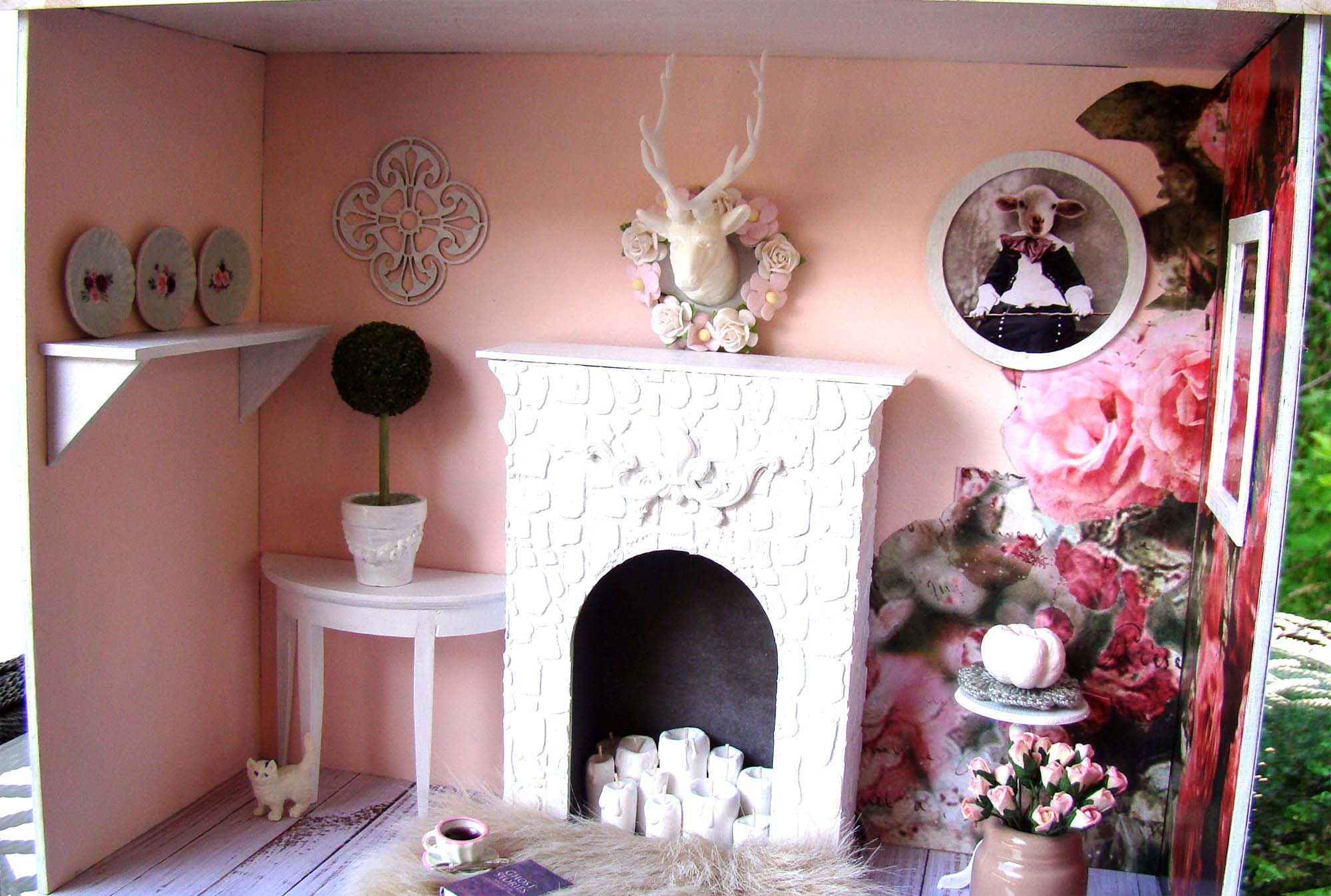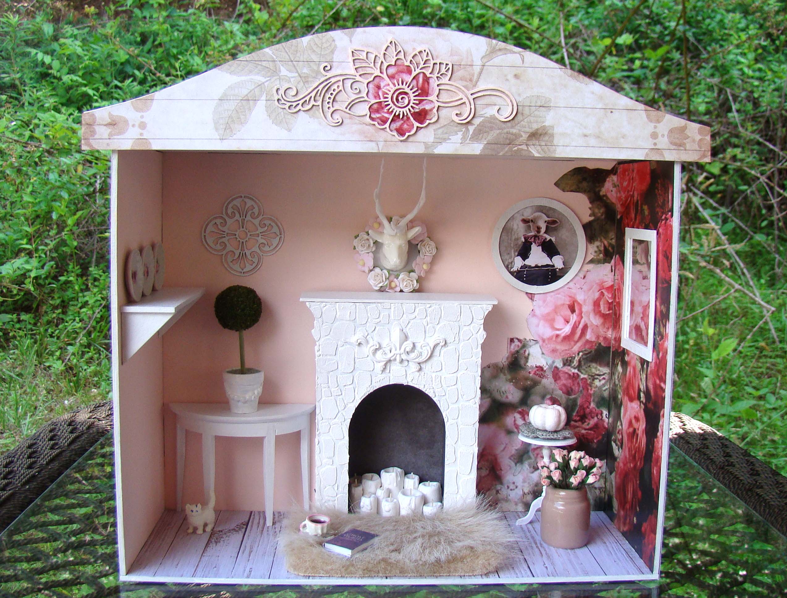 I am happy to share another project for Alpha Stamps today. They have a new Room Box with a Curved Facade at the top which is a really nice size for setting a scene. At 8 by 10 inches it’s the perfect dimension to design a space using 1:12 furniture. I had tons of ideas of what to use it for an settled on a parlor with a fireplace focal point. The pink and white color scheme was determined when I saw the the gorgeous new Antique Roses 12×12 paper pack.