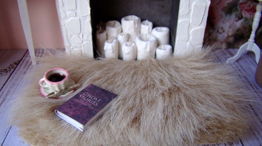 I made a cozy resting spot in front of the fireplace that includes a Mini Cup of Coffee with Spoon, a book of ghost stories made from a Miniature Book and a cover from the Little Library Collage Sheet. The rug is a bit of faux fur I found at a fabric store. I always wander through the trim and notions section to see if anything grabs my attention.