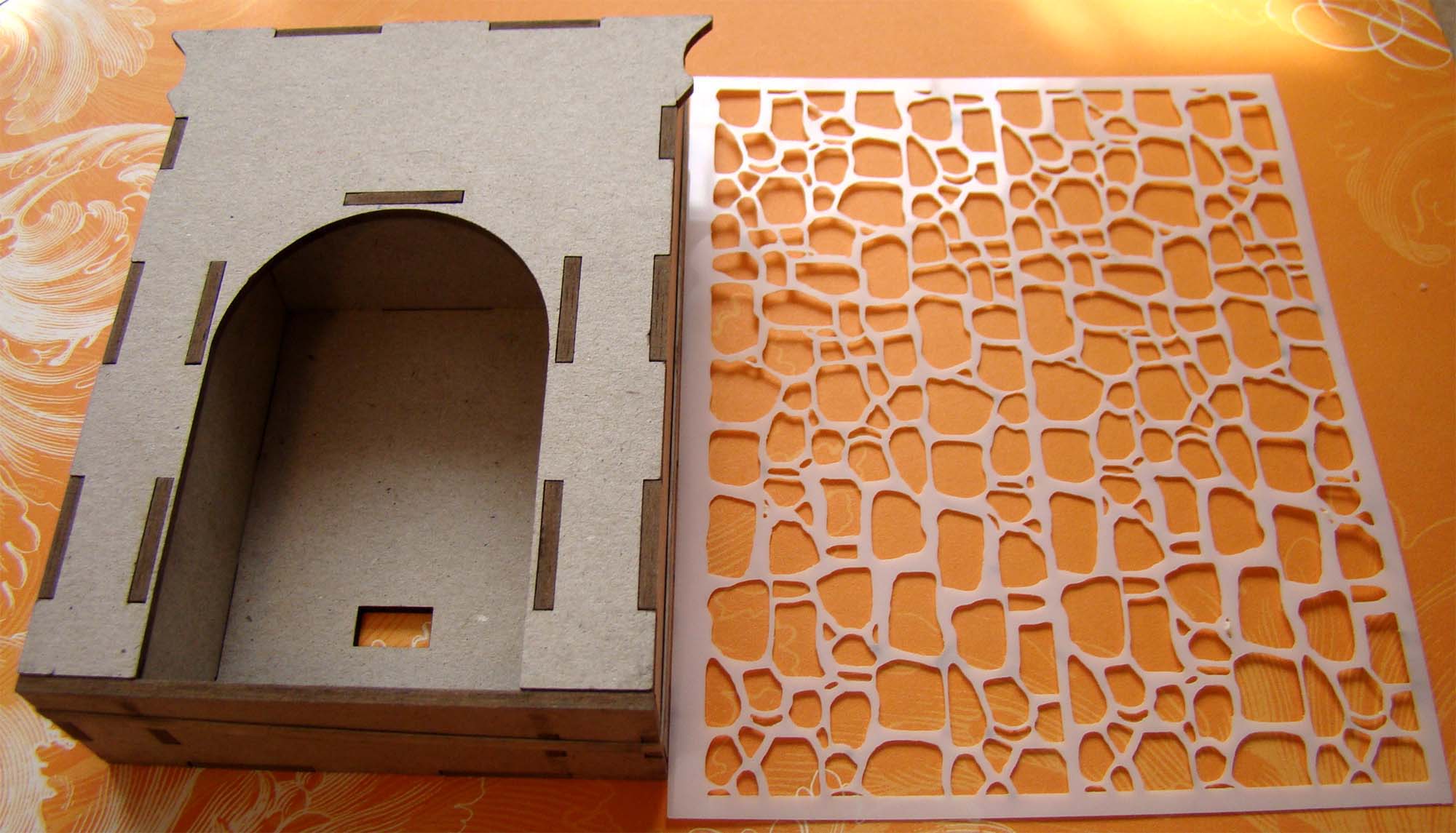 I got started on this project with the Narrow Victorian Fireplace. Once it was assembled using tacky glue, I added a stone facade using the Small Stone Wall Stencil. These stencils are made of mylar which makes them both easy to both use and clean.
