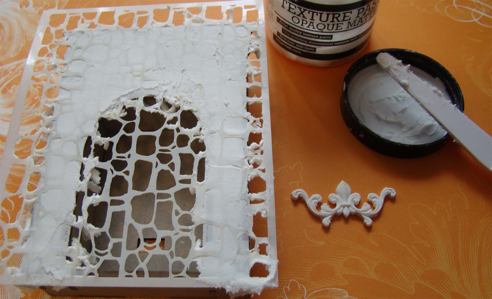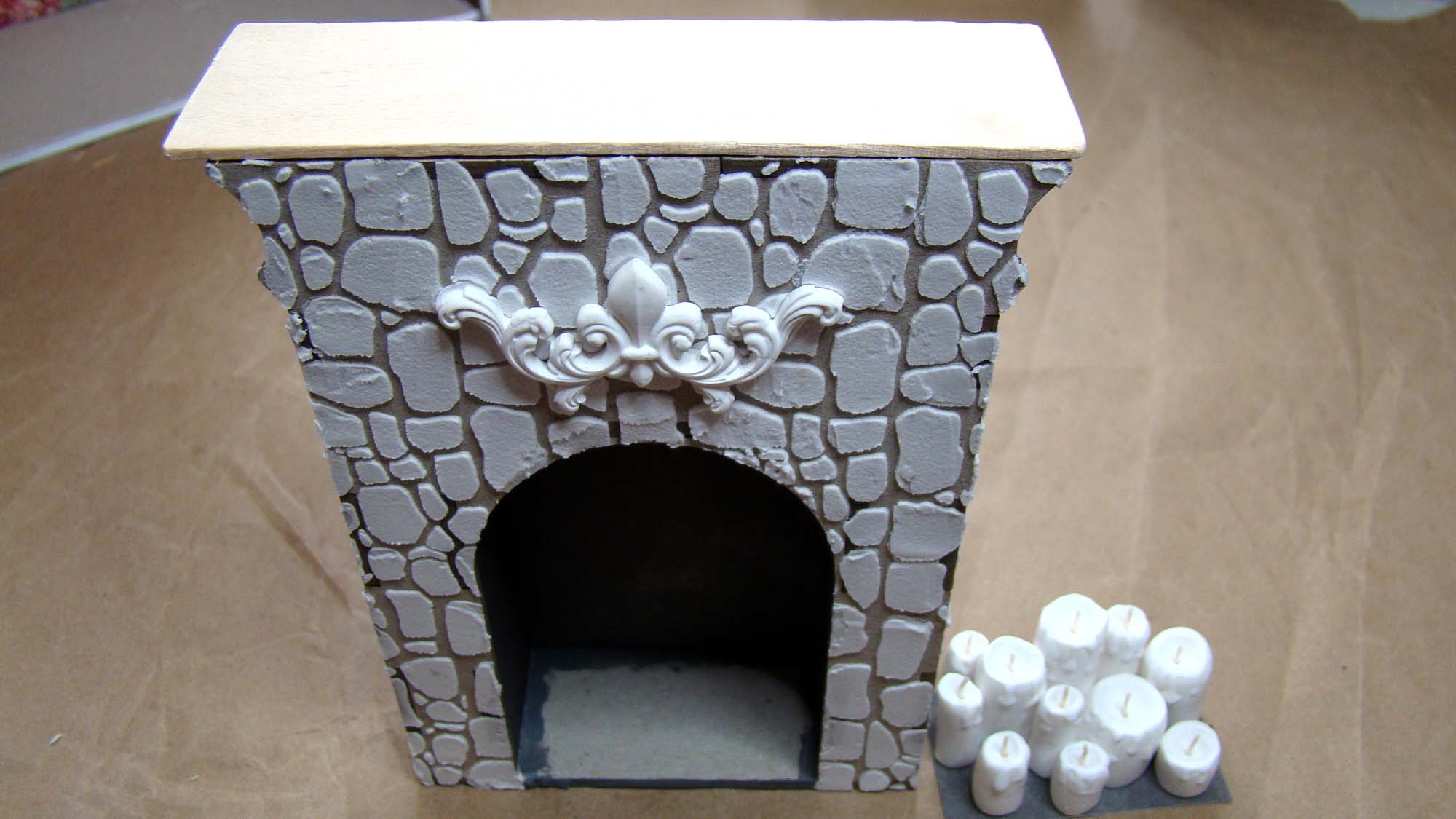 I made a fancy embellishment for the front of the fireplace using the French Flourishes Silicone Mold and white polymer clay. I love using these molds because they can be popped right inside the oven to bake the clay off. Texture paste was used for the stones and the fluorish embellishment was set into the wet paste while it dried overnight.