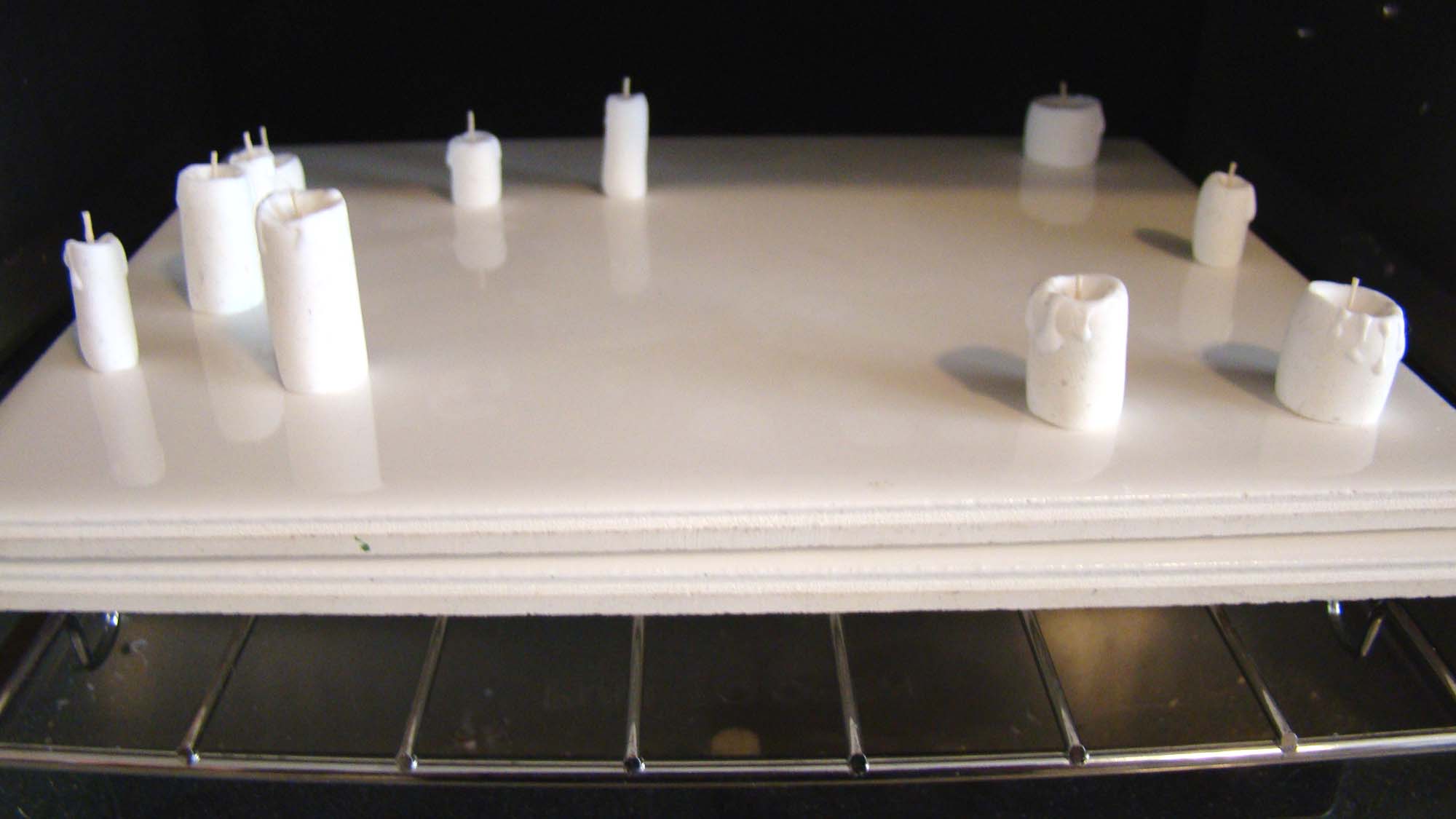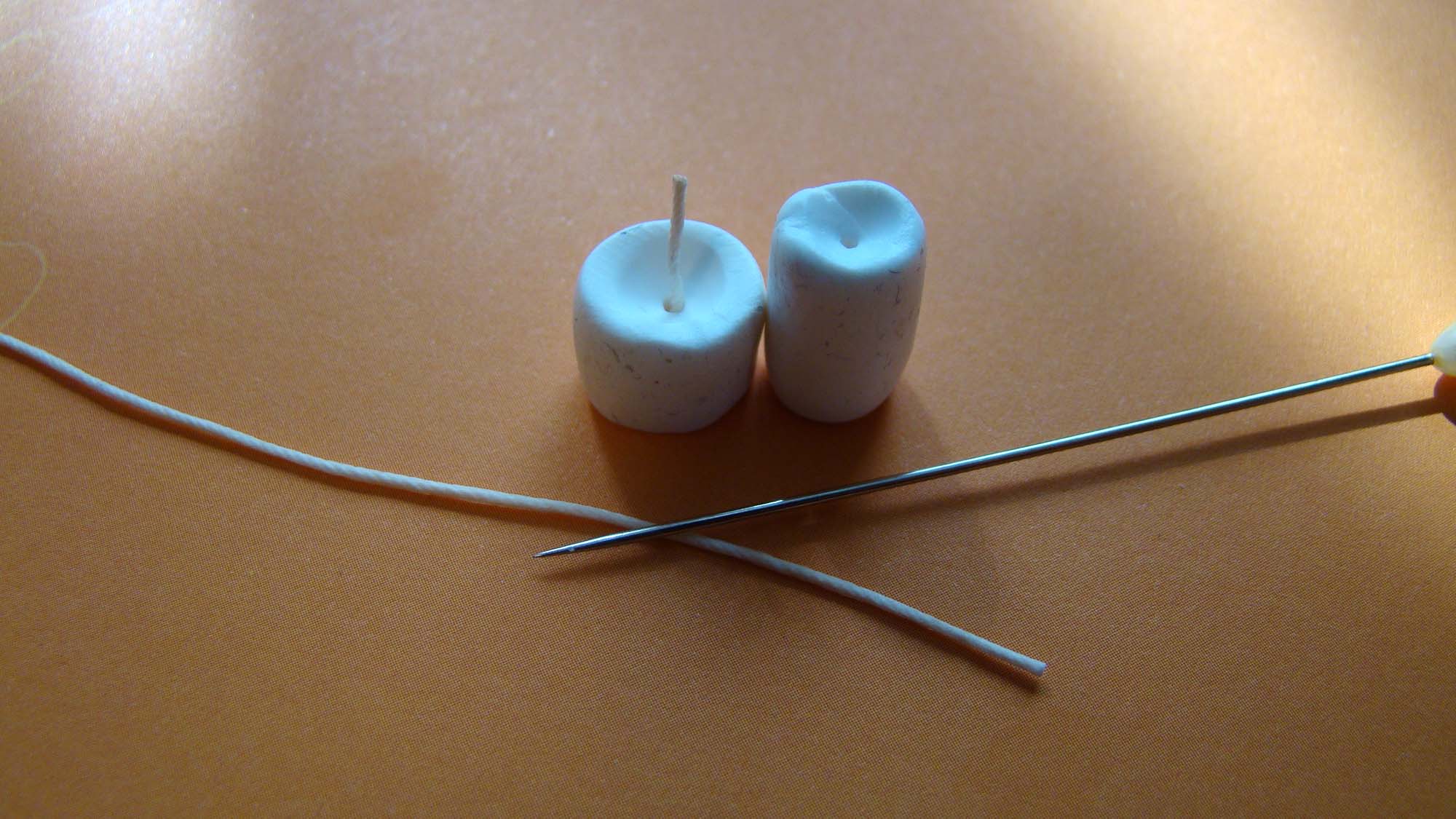 The candles themselves are cylinders of white polymer clay that were cut to different heights and indented using a ball stylus sculpting tool. The wicks were simply made from thread that was stiffened with white glue and cut to length. I used a straight pin to make a holes inside the candles where the wicks were inserted.