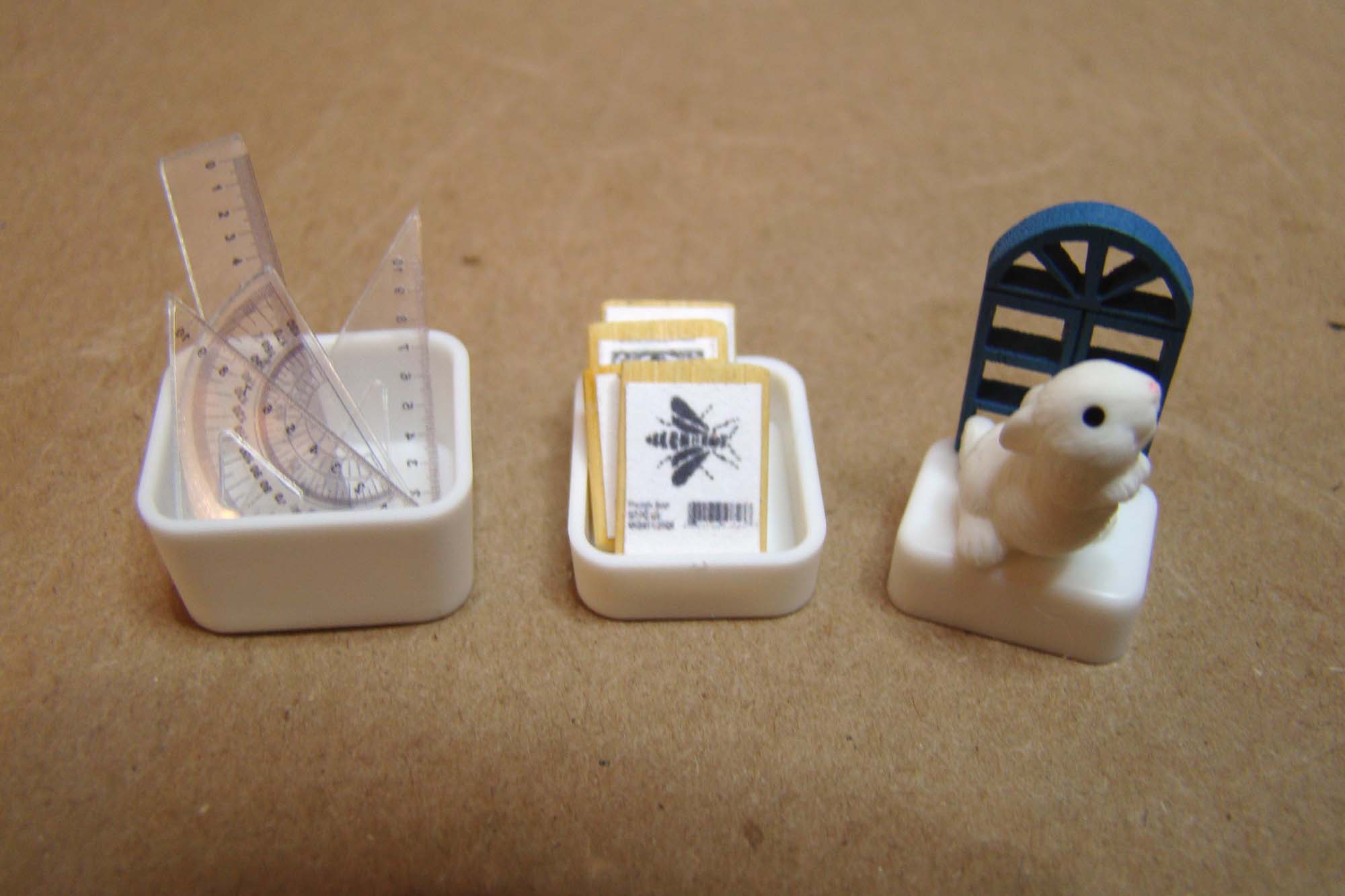 I glued stamp pad labels onto black and white foam sheets then cut them out. They fit perfectly into the tray from the Square Wooden Boxes with Lids in Tray. One of those cute boxes found it’s way into the cubby display case.