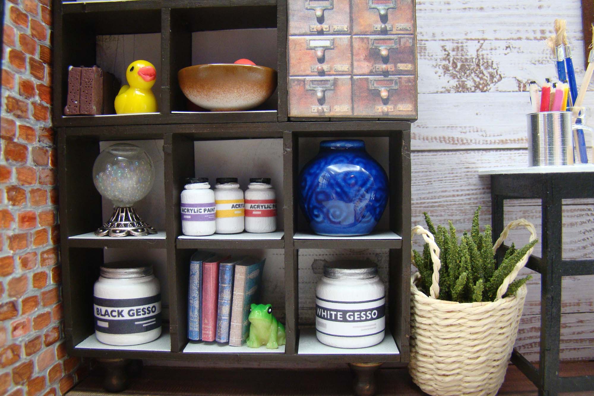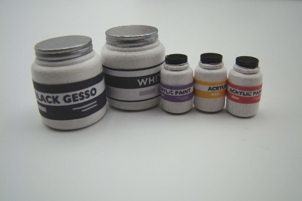 I of course used the Tiny Craft Room Labels Collage Sheet for a few practical accessories for the art studio. I had some miniature turned wooden bottles in my stash that I painted white and added gesso and acrylic paint labels to.