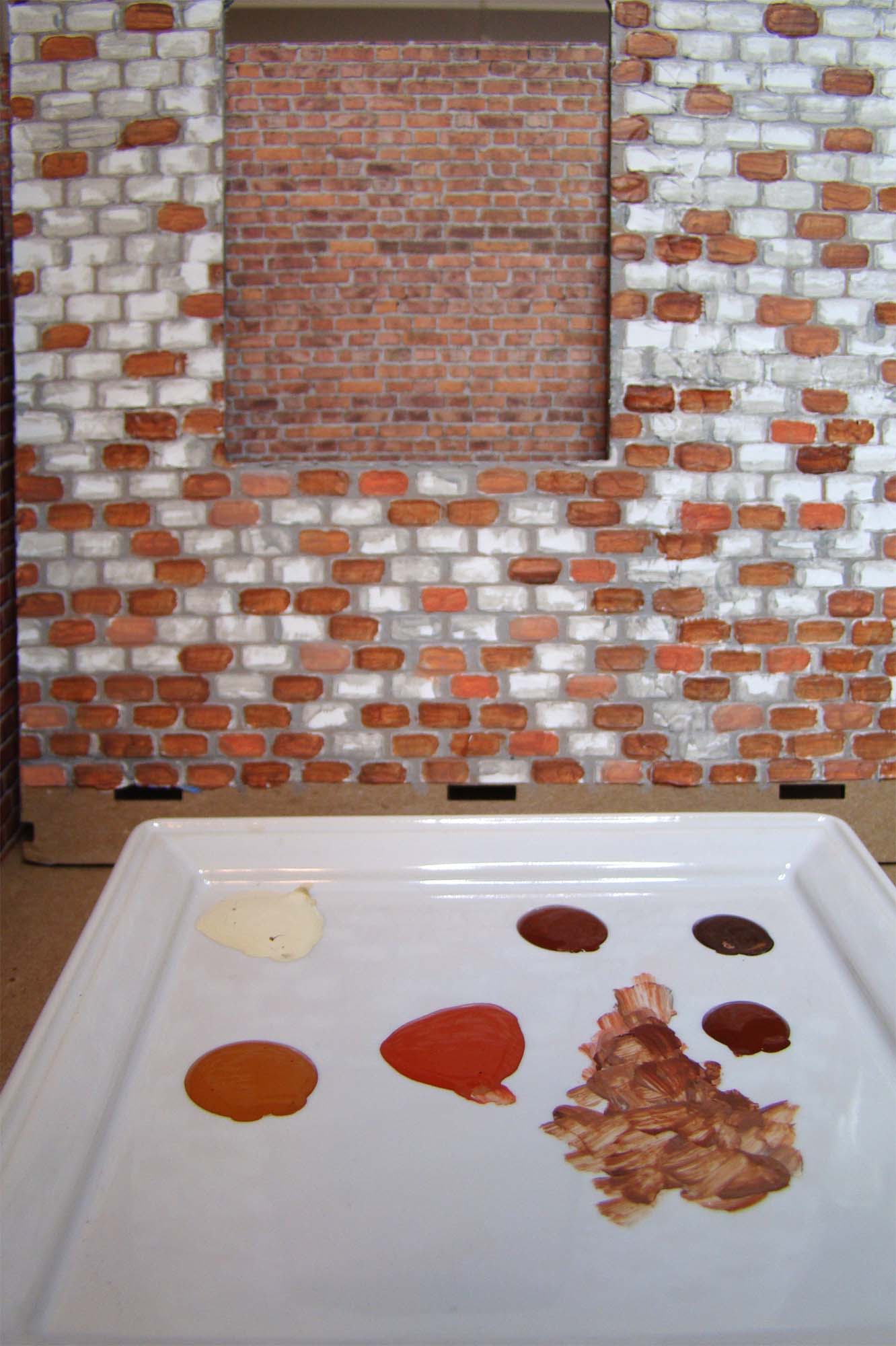 From there, I chose a combination of acrylic brick colors and just randomly painted and layered color on each brick until I was satisfied with the result. The small brick pattern you see in the background is a sheet of scrapbook paper I used for inspiration.