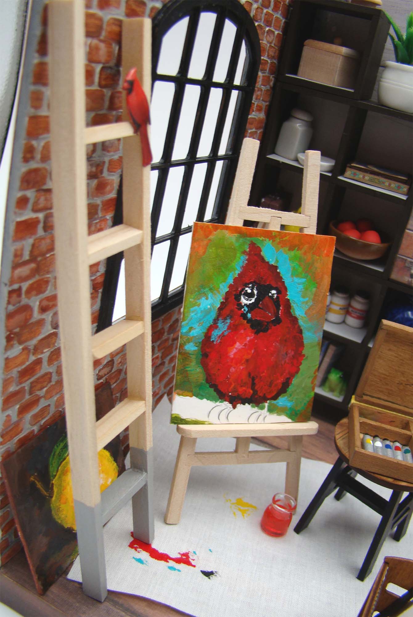 I painted the bottom of a Tall Wooden Ladder and added a cardinal brad for inspiration. The red bird painting on the Miniature Easel with Blank Canvases is a work in progress. There’s a Miniature Paint Set in Box sitting on the stool and the 15mm Tall Glass Jar on the drop cloth has some tinted resin in it to represent a paint brush rinse cup.