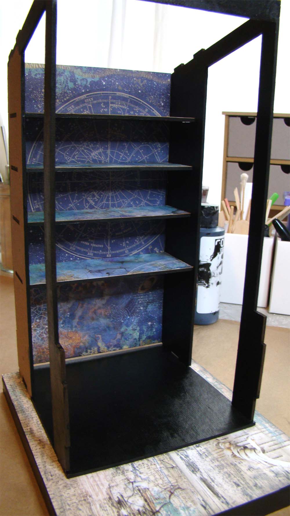 The cabinet is really easy to assemble using tacky glue. Before gluing the piece together I used the exterior rear wall as a template for cutting the cabinet’s curves in this beautiful paper.